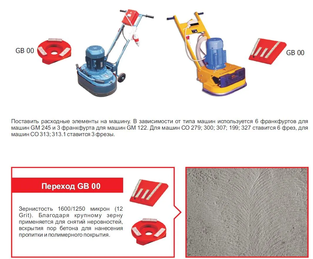 Алмазная сегментарная фреза GFB 00 используется в мозаичных шлифовальных машинах для быстрого снятия неровностей бетона. Применяется для агрессивной и грубой шлифовки и создания ровной поверхности для нанесения высокоадгезивного покрытия. Глубина царапин достигает 0,95 мм, что позволяет быстро справиться с работой.