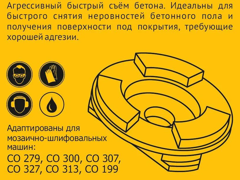 Модель имеет оптимальные размеры сегментов для проведения грубого снятия бетона – 40х12,5х5,5. В результате работы шлифовальной фрезой №00 получается выровненный пол с шероховатостью 0,95 мм, предназначенный для дальнейшего нанесения покрытия. Продуманное расположение сегментов позволяет отнести конструкцию модели к антиударным.