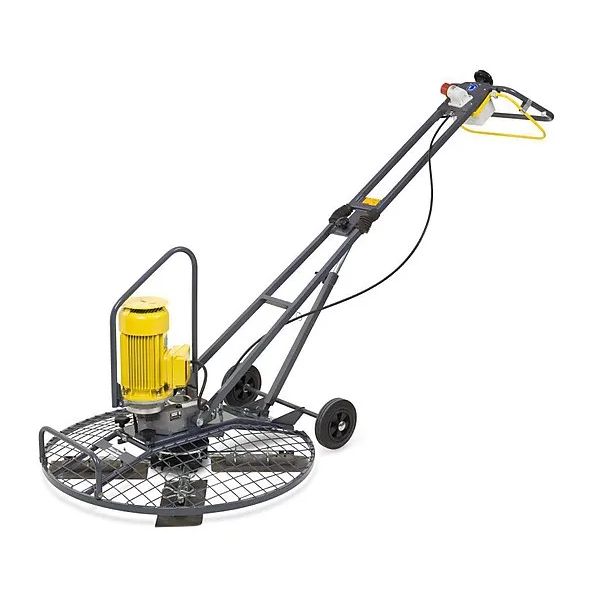 Профессиональные бетоноотделочные машины с электрическим двигателем BG Combi поставляются с взаимозаменяемыми защитными кожухами диаметром 850 и 1020мм, которые легко крепятся к раме с помощью двух прижимных винтов. Защитный кожух, изготовленный из стальной проволочной сетки, дает широкий обзор зоны обработки. Магнитный выключатель, установленный на машине, делает невозможным пуск двигателя со снятым защитным кожухом. Подпружиненная скоба в верхней части рукоятки выполняет функцию блокиратора электрической цепи. Эксплуатация возможна только при прижатом положении скобы к рукоятке. Вся электропроводка уложена в трубки рукоятки, что надежно защищает ее от различных повреждений. Бетоноотделочная машина BG240 сконструирована таким образом, что диаметр зоны заглаживания регулируется и имеет три положения: 865, 950, 1015мм и может легко изменяться передвижением ножей к центру или от центра крестовины.