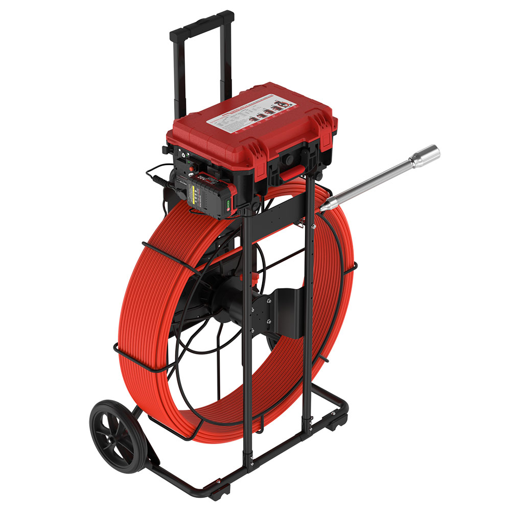 Проталкиваемая ТВ камера серии MAXI для осмотра канализационных труб. Длина кабеля 120м, диаметр 9 мм, монитор 13.3”, головка камеры 39х77мм с самовыравниванием и разрешением 1080Р (1920х1080). Аккумулятор с увеличенной емкостью. Рама с счетчиком, тормозом вытягивания кабеля и колесиками. Вес 63,5 кг.