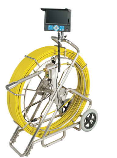 Проталкиваемая телеинспекция с 120м стекловолоконным кабелем и 7″ монитором с DVR плеером, на раме с колесиками.