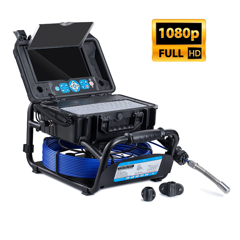 Full HD камера разрешением 1080P (1920×1080) для четкого просмотра труб диаметром 25мм — 200мм и на длину 30м. Со счетчиком расстояния и записью видео и аудио. 10″ монитор с DVR плеером внутри кейса. Кабель 5.2мм на раме с внешней стороны.