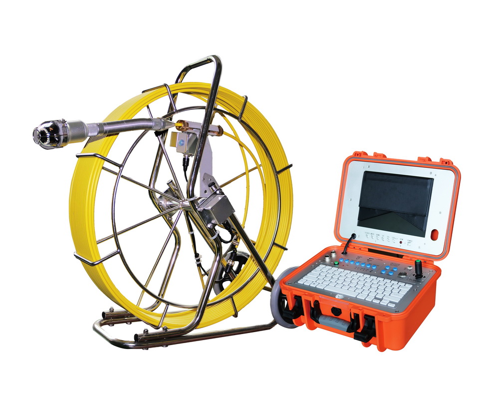 Проталкиваемая телеинспекция с 60м стекловолоконным кабелем 9мм и 10″ монитором с SD-слотом для записи видео и картинок, с счетчиком расстояния, на раме с кейсом. Головка камеры 56мм с самовыравниванием, наклоном и обзором на 360 градусов.