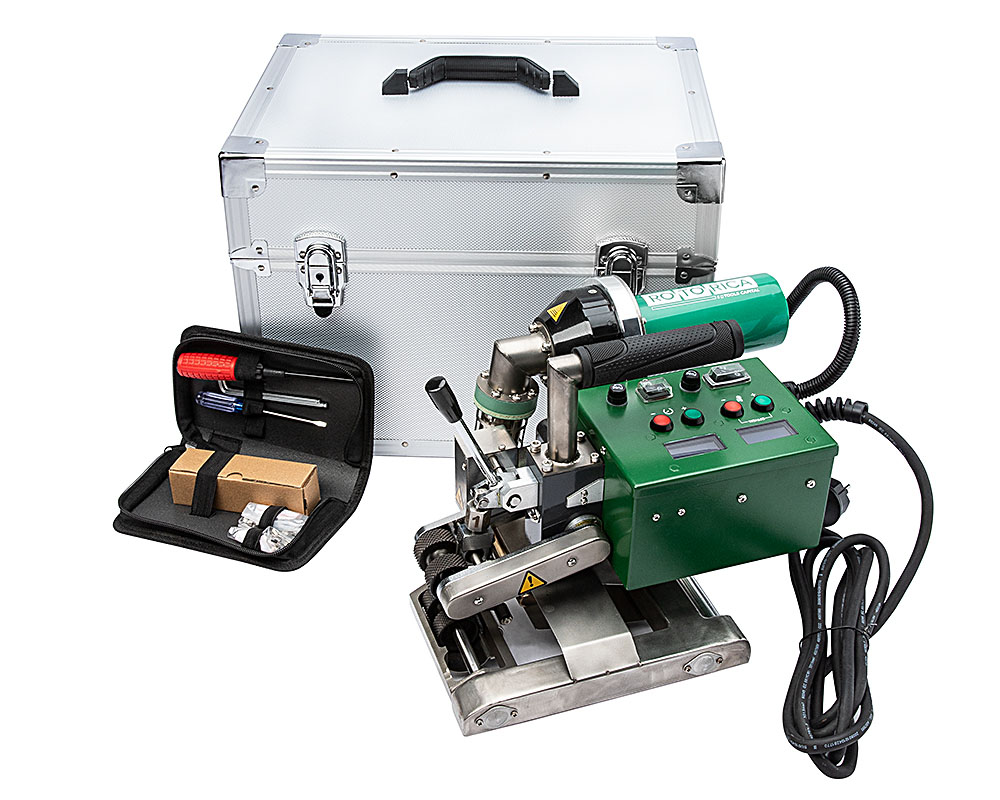 Автомат для сварки геомембраны горячим воздухом и горячим клином. Напряжение 230 В. Мощность 2800 Вт. Температура 50 ~ 620 0С. Скорость сварки 0,5 — 3,5 м/мин. Два LCD дисплея. Вес 7,9 кг.