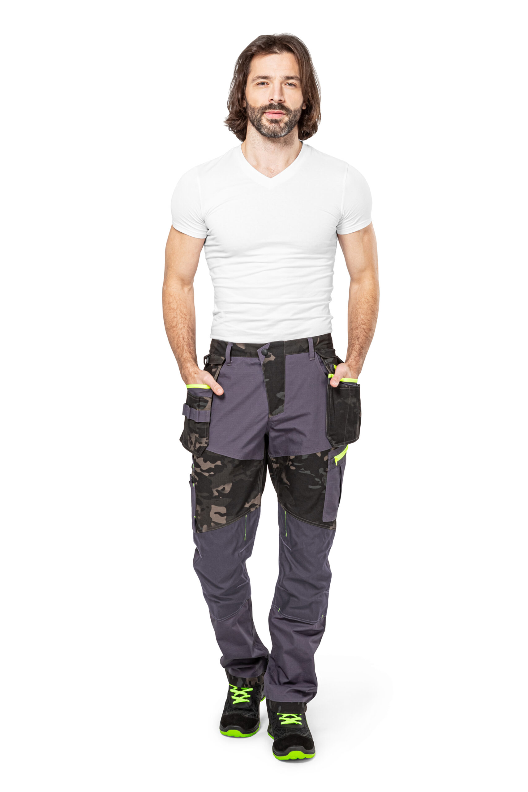 Брюки летние и демисезонные мужские из смесовой ткани Рип-Стоп с преобладанием хлопка, цвета КМФ хаки в сочетании с сегментами ткани синего цвета, для защиты от общих производственных загрязнений и механических воздействий (истирания). • Застежка: молния, металлическая пуговица • Карманы: — верхние навесные съемные мультикарманы с множеством отделений под инструмент с креплением на молнию, отделение правого мультикармана застегивается на молнию неонового цвета, оба кармана отделаны контрастной окантовкой неонового цвета — два боковых глубоких кармана, два нижних кармана: правый карман с отлетным низом, имеет пять отделений для канцелярии и инструмента, левый карман фигурной формы объемной конфигурации с застежкой на молнию неонового цвета- два задних кармана: правый накладной с клапаном фигурной формы и застежкой на контактную ленту, левый накладной карман • Элементы защиты: — усилительные накладки анатомической формы в области коленей из износостойкой ткани Кордура со входом для амортизационных вкладок • Элементы комфорта: — анатомические вытачки в области коленей- пластиковая петля для ключей и бэйджа- силиконовое покрытие внутренней стороны пояса для фиксации по талии- шлевки под ремень- закрепки выполнены контрастной нитью неонового цветаКаждое изделие упаковано в индивидуальный пакет-сумку из прочного Спанбонда.Несколько слов о ткани:- очень прочная на разрыв и имеет высокие износостойкие характеристики- долговечна в эксплуатации, за счет применения комбинированного переплетения нитей «крест-накрест»- исключительно надежна: материал не рвется и не расходится при возникновении порезов или отверстий- обладает повышенными дышащими свойствами и низкой сминаемостью- приятные тактильные ощущения