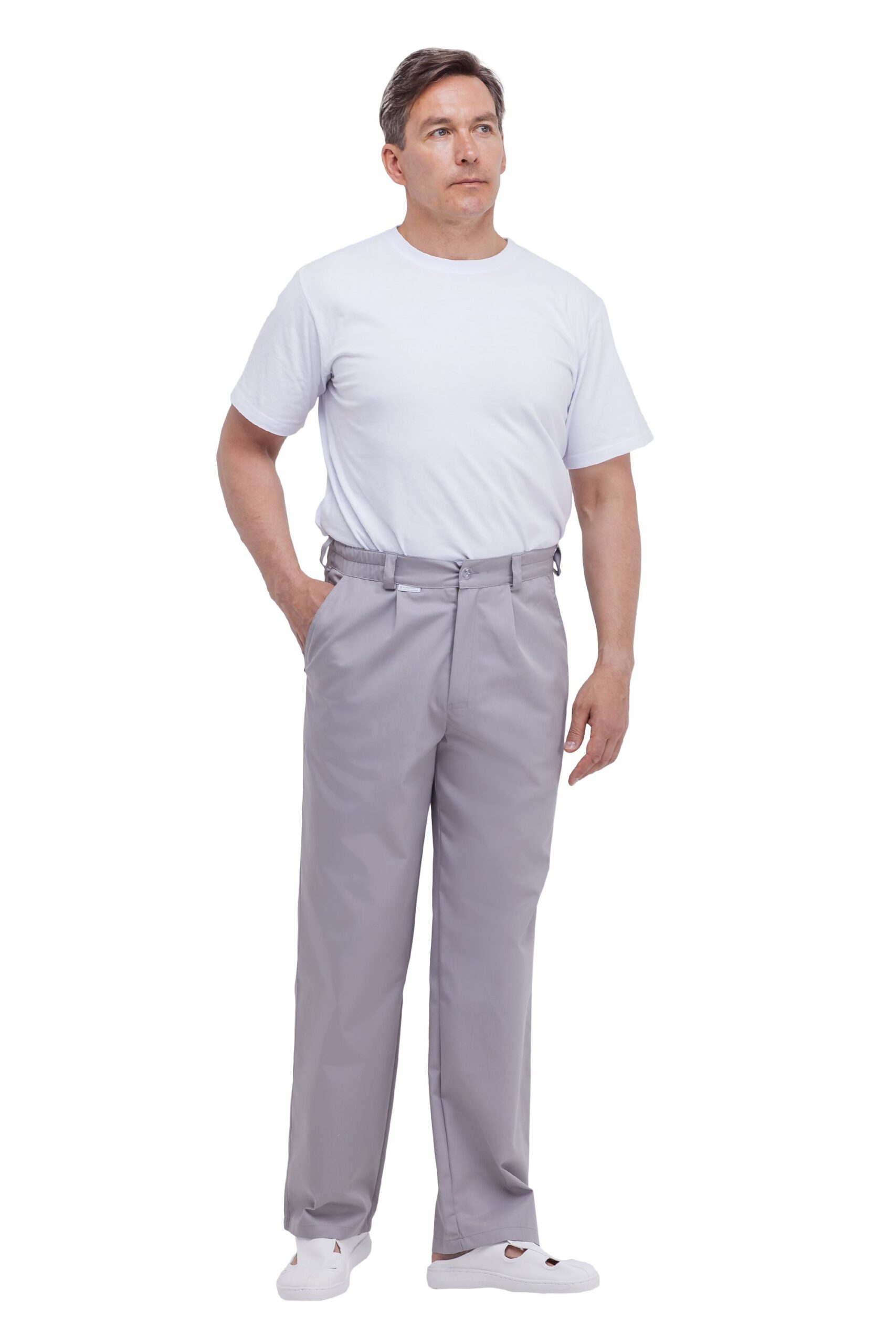 Брюки с притачным поясом с эластичной тесьмой, с шлевками для ремня и застежкой в среднем шве на молнию. Передние части брюк с боковыми внутренними карманами.
