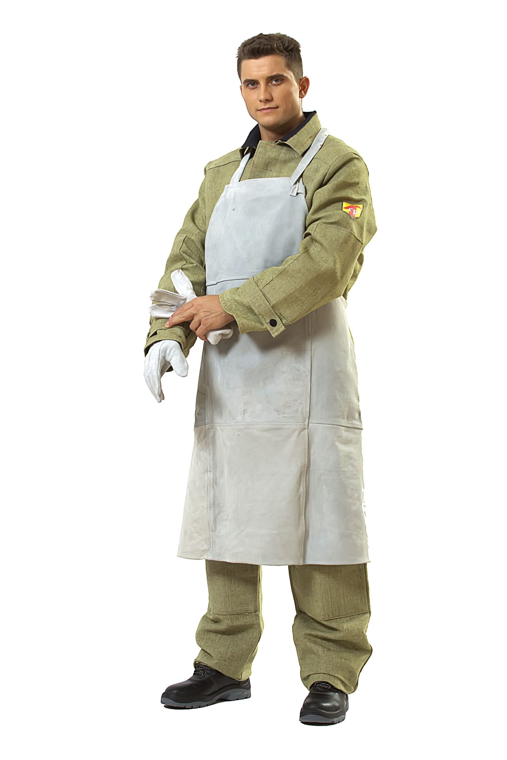 Фартук с нагрудником из спилка используется при выполнении сварочных работ и с расплавленными металлами. • Фартук длиной 90 см, шириной от 62 см до 78 к низу изделия • По боковым сторонам фартука располагаются части пояса, завязывающиеся на талии. • В верхней части фартука имеется шейная бретель, без регулировки по высоте. • Фартук устойчив к воздействию искр и брызг расплавленного металла, окалины, к повышенным температурам и механическим воздействиям, истиранию.
