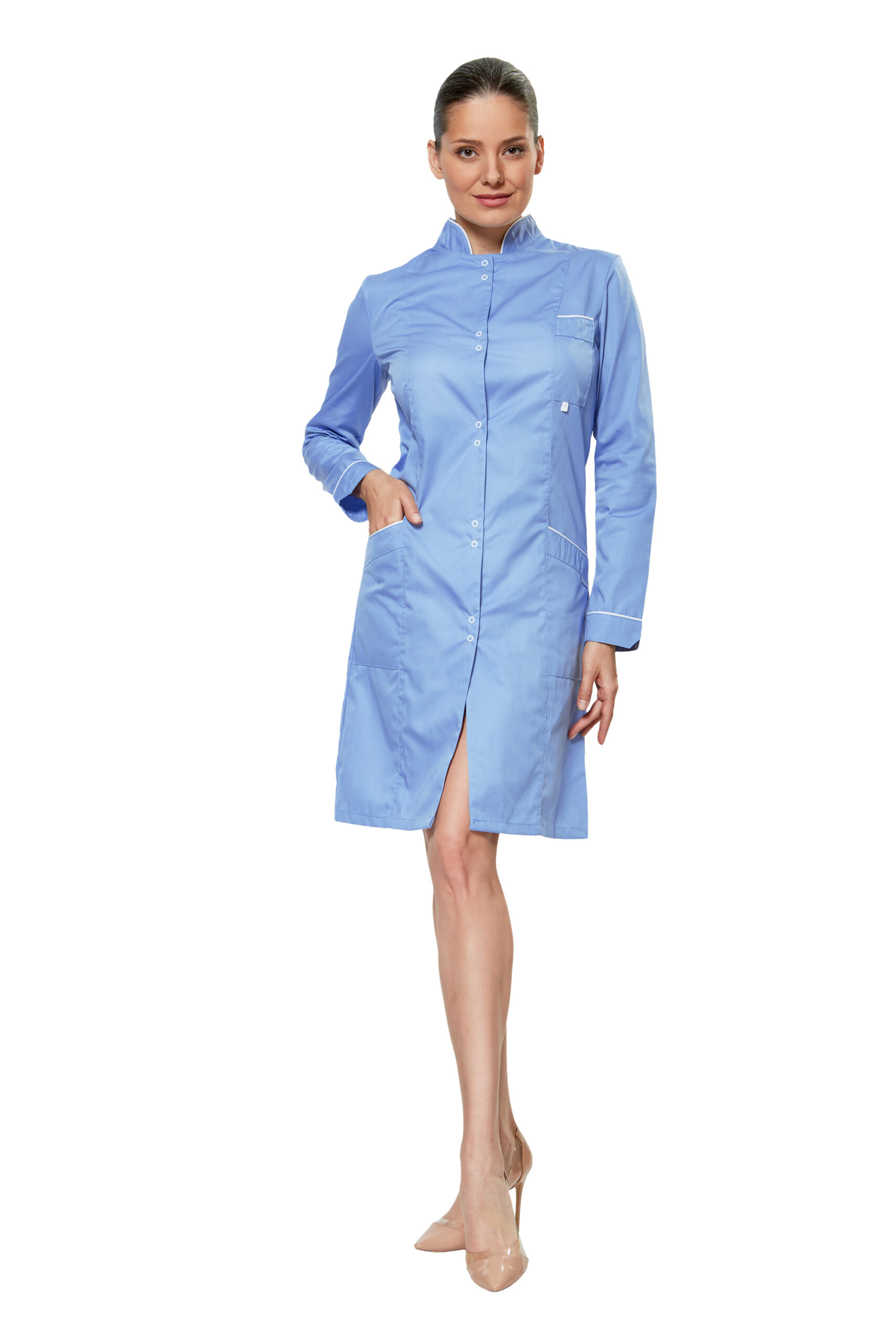 Халат полуприлегающего силуэта, с рельефами, с воротником-стойкой, с застежкой на кнопки. Два нижних кармана и один нагрудный карман с петлей для крепления бейджа. Длина халата до середины колена, что позволяет носить халат как отдельным предметом так и в комплекте с брюками. Отделка белым кантом по контуру стойки, карманам и низу рукавов.