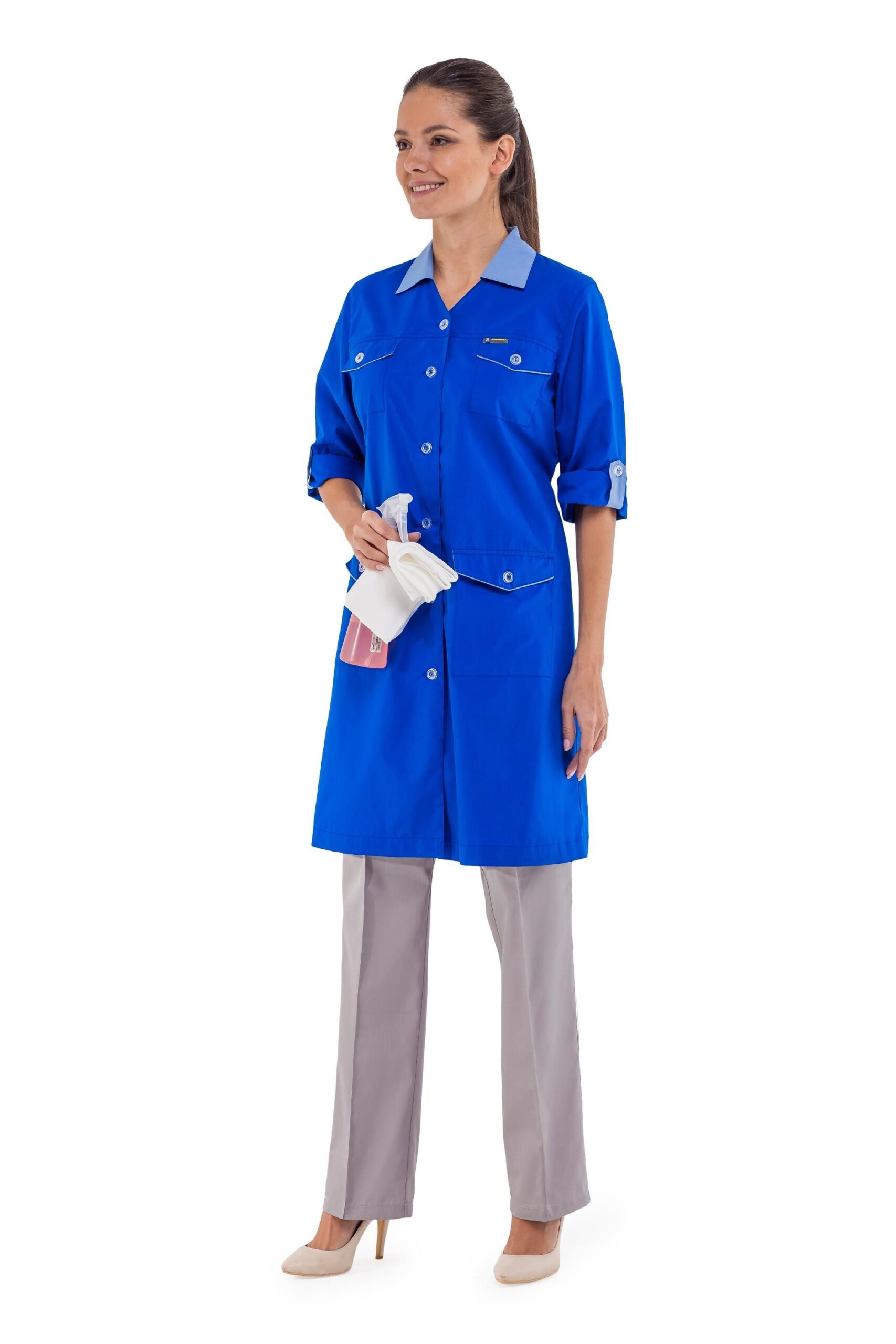 Халат прямого силуэта с рельефами на спинке, с отложным воротником и центральной застежкой на пуговицы. Нижние и нагрудные карманы с клапанами, застегивающимися на пуговицу. Рукава длинной 3/4 с возможностью регулировки по длине при помощи паты и пуговицы. Длина халата до середины колена, что позволяет носить халат как отдельным предметом так и в комплекте с брюками. Объем халата по талии регулируется завязывающимся поясом на спинке. Воротник и отделка клапанов выполнены из отделочной ткани.