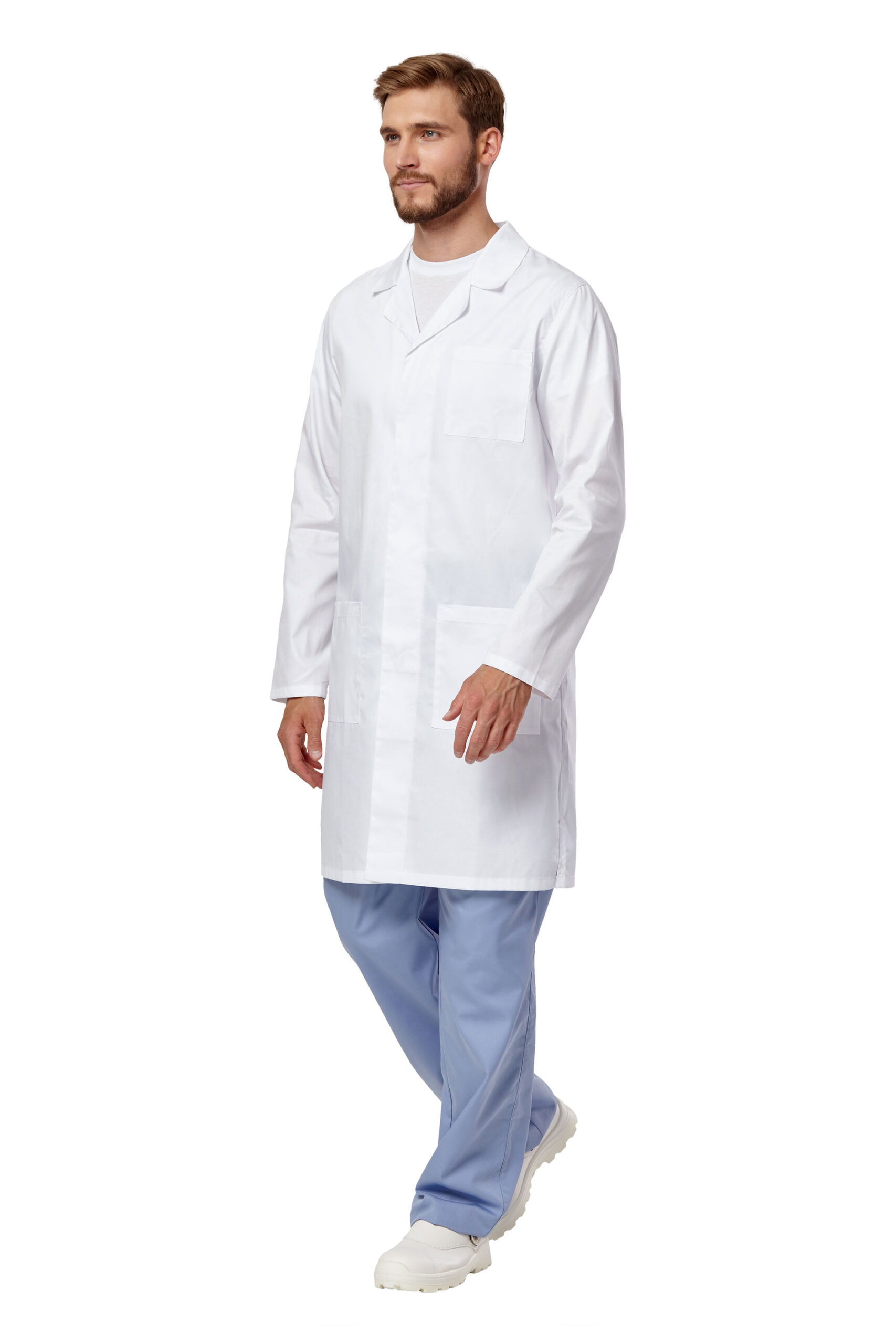 Халат прямого силуэта с длинными рукавами, отложным воротником, с потайной застежкой на пуговицы. Два нижних кармана и один нагрудный карман с отделением для ручки. Разрезы в боковых швах.
