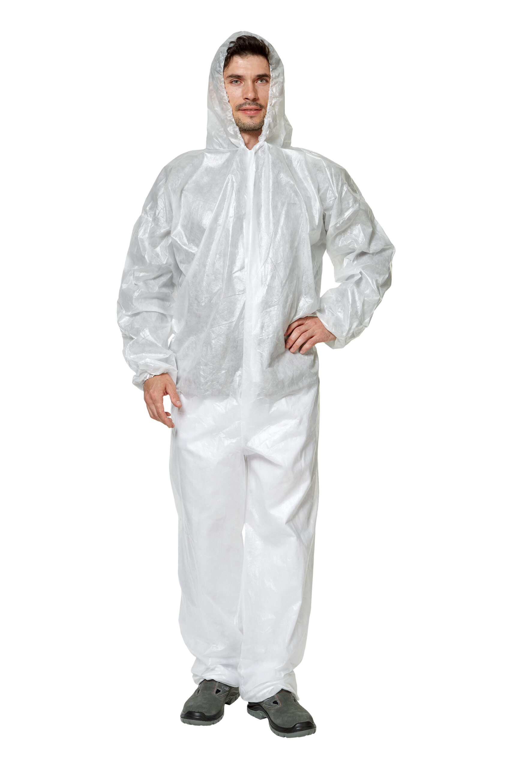 Комбинезон одноразовый из ламинированного спанбонда, плотность 40-50 г/кв.м. Водостойкий, лёгкий и прочный, защищает от краски, пыли, грязи. Не образует ворса. Центральная застежка на молнию. Разрешен к применению в медицине, фармацевтической и пищевой промышленности. Цвет белый или голубой