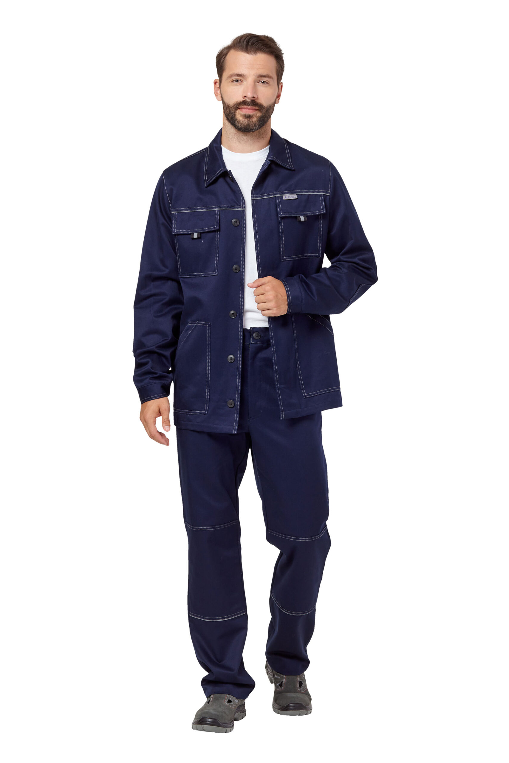 Костюм: куртка и брюки.Удлиненная куртка прямого силуэта, с центральной потайной застежкой на пуговицы, с отложным воротником, рукава с налокотниками. В швах притачивания кокеток на спинке и полочках расположен светоотражающий кант шириной 3мм. Два прямых накладных нагрудных кармана с клапанами, застегивающимися на контактную ленту и два нижних накладных кармана с наклонным входом. Брюки с притачным поясом со шлевками. Два боковых кармана с отрезным бочком, с усилительными накладками, в нижнюю часть которых втачан СВ кант шириной 3мм. Один задний накладной прямой карман.Застежка-гульфик на молнии.