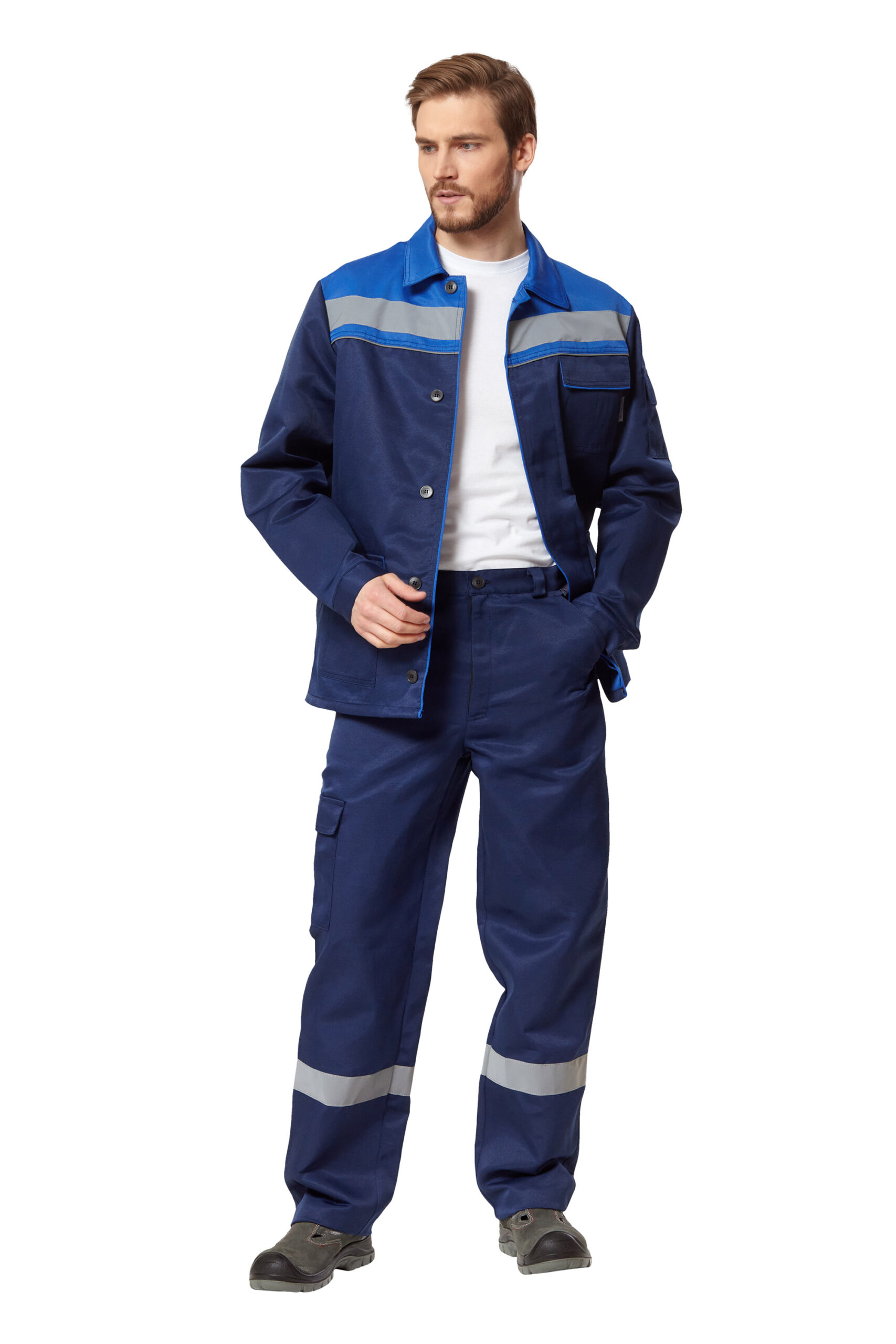 Костюм классического фасона из куртки и брюк со светоотражающим кантом и полосами 50 мм шириной. Куртка • Силуэт: прямой • Застежка: потайная на пуговицы • Воротник: отложной • Карманы: 1 нагрудный накладной с клапаном на контактной ленте; нижние накладные с клапанами на контактной ленте; в верхней части рукава накладной с клапаном на контактной ленте • Элементы комфорта:- этикетка для ФИО на внутренней стороне левой полочки- регулирование ширины манжет рукавов при помощи пуговицБрюки • Застежка: молния, пуговица • Карманы: верхние боковые; 1 задний накладной; накладной боковой с клапаном на контактной лент • Элементы комфорта:- шлевки под ремень • Визуальные элементы защиты: световозвращающий кант по шву притачивания кокеток полочек и спинки, световозвращающая лента шириной 50 мм параллельно швам притачивания кокеток на куртке и в нижней части брюк