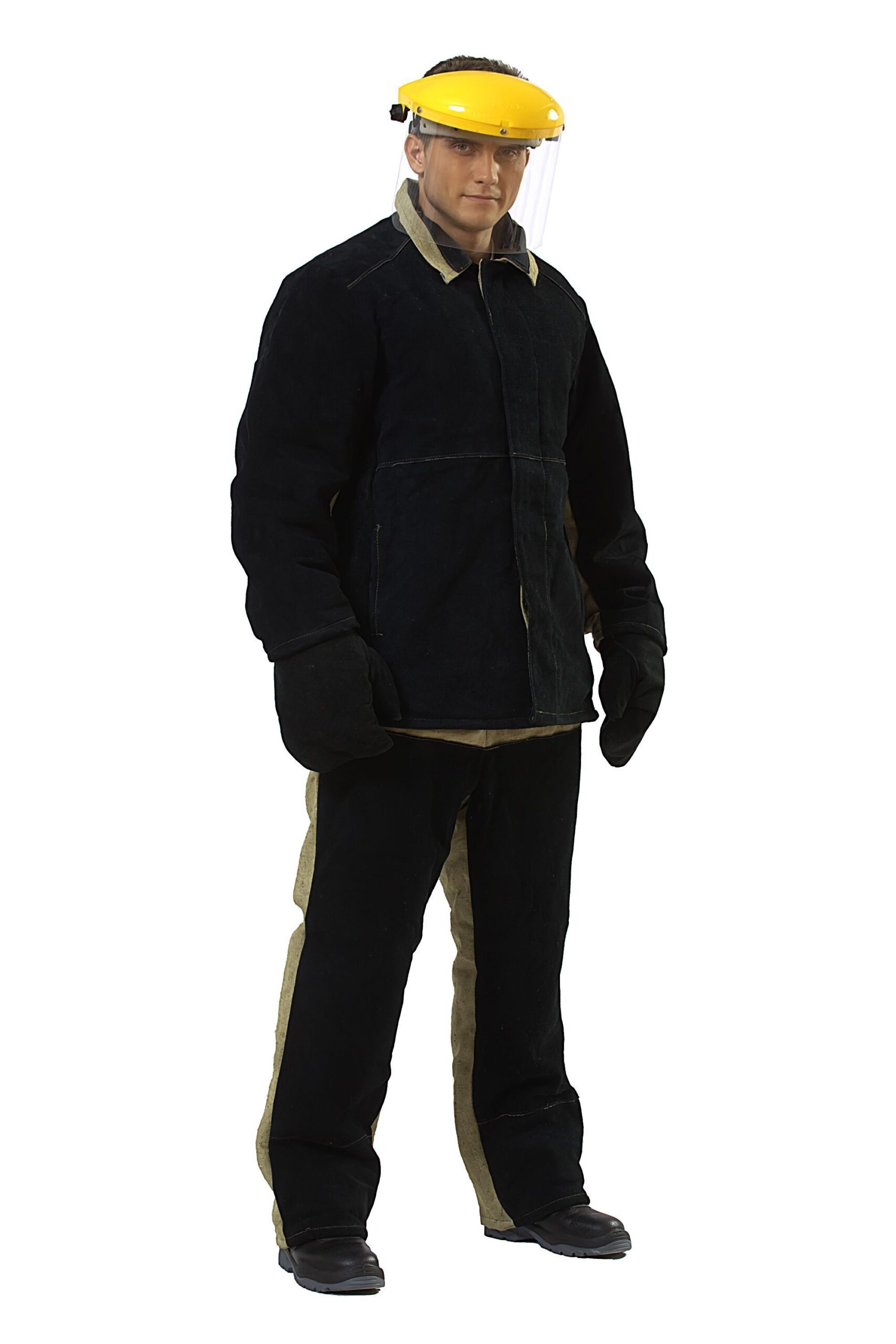 Костюм из куртки и брюк 2 класса защиты. Предназначен для защиты от рисков при выполнении операций ручной сварки, при которых расстояние от работающего до источника брызг металла, металлической окалины порядка 50 см., в том числе в монтажных и полевых условиях, при работе в цехах.Куртка с супатной застежкой на пуговицы, с карманами в боковых швах. Брюки свободного прямого покроя. В изделии используются накладки из спилка КРС общей площадью 230 дм?. Модель с притачным утеплителем из ватина.