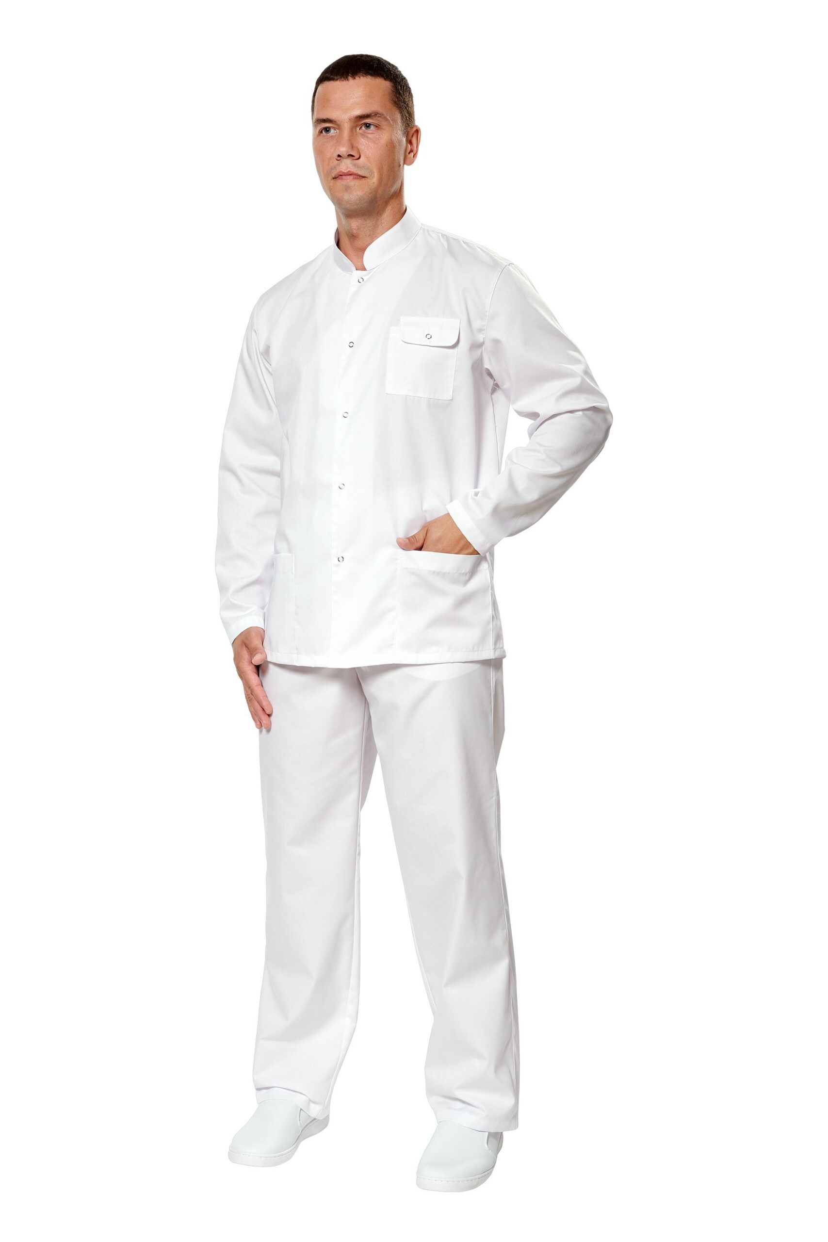 Куртка прямого силуэта с длинными рукавами, с воротником стойкой и центральной застежкой на кнопки. На спинке складки, обеспечивающие свободу при движении. Два нижних кармана и один нагрудный карман с клапаном и отделением для ручки. Ширина низа рукава регулируется при помощи кнопок.