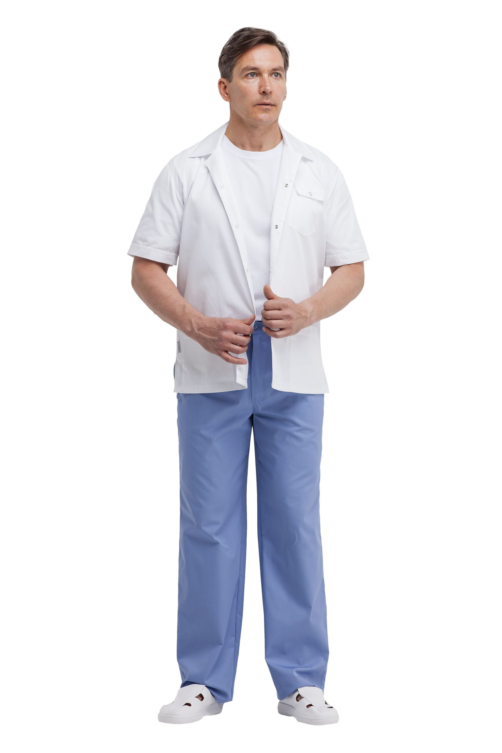 Куртка прямого силуэта с короткими рукавами, с отложным воротником и центральной застежкой на кнопки. На спинке складки, обеспечивающие свободу при движении. Два нижних кармана и один нагрудный карман с клапаном и с отделением для ручки.