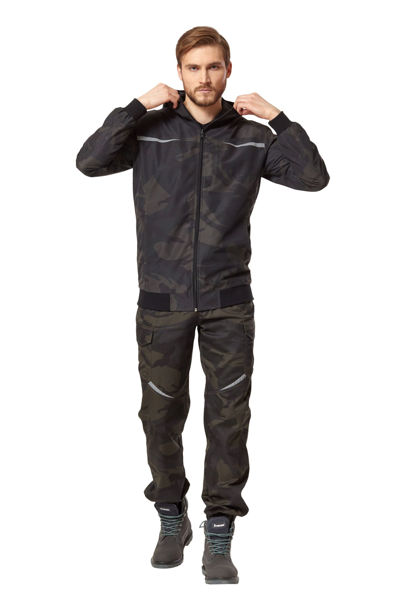 Двухсторонняя куртка-ветровка летняя и демисезонная из синтетической ткани: внешняя сторона — камуфлированная цвета хаки, внутренняя сторона — черного цвета, для защиты от общих производственных загрязнений. • Силуэт: прямой • Застежка: молния • Карманы: на камуфлированной стороне — нагрудный левый; нижние боковые; на черной стороне – нагрудный левый на молнии; два нижних боковых • Визуальные элементы защиты: фигурные световозвращающие элементы на кокетках полочек • Элементы защиты: ткань имеет водоотталкивающую (ВО) пропитку, с внутренней стороны ткань усилена ТПУ пленкой. • Элементы комфорта: — куртка двухсторонняя двухцветная: одна сторона камуфлированная цвета хаки, вторая сторона черного цвета- притачной капюшон- манжеты рукавов из эластичного трикотажа- пояс куртки из эластичного трикотажа- удобный пластиковый пуллер на молнии Каждое изделие упаковано в индивидуальный пакет-сумку из прочного Спанбонда.