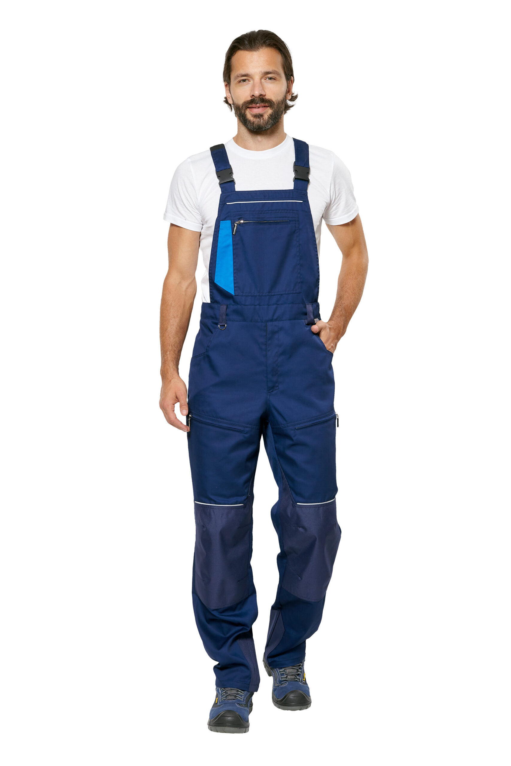 Полукомбинезон с высокой грудкой из малосминаемой ткани Милан (пр-во Клопман). Каждая единица товара в индивидуальной упаковке из спанбонда. • Застежка: молния • Карманы: нагрудный карман на молнии, с малым для канцелярии; верхние боковые; на передней части бедра карманы на молнии; задние накладные • Визуальные элементы защиты: световозвращающие полосы шириной 3мм по верхним швам притачивания наколенника • Элементы защиты: усилительные накладки анатомической формы в области коленей и задняя шлевка пояса из износостойкой ткани • Элементы комфорта: — вставки из эластичного трикотажа на боковых частях спинки- регулирование длины бретелей при помощи эластичной тесьмы и фастексов- шлевки под ремень- металлическое полукольцо для крепления мелких предметов на поясе- регулирование ширины по линии талии спинки при помощи эластичной тесьмы — наколенники с вытачками- низ изделия усилен накладками из ткани Кордура