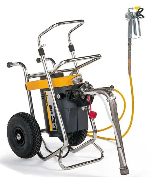 Окрасочный агрегат Wagner SuperFinish 31. Высокая надежность достигается применением в конструкции клапана из износоустойчивого твердого сплава, мембраны из стойкого к воздействию растворителей полиамида. Увеличенный рабочий ход мембраны обеспечивает возможность работы с жидкими и высоковязкими материалами. Агрегат Wagner SuperFinish 31 оснащен тележкой с пневматическими шинами, что позволяет легко перемещать окрасочный агрегат. Размеры агрегатов позволяют транспортировать их в багажнике легкового автомобиля.