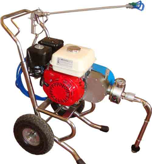Покрасочный агрегат с бензиновым приводом Airless Sprayers 6845. Окрасочный аппарат предназначен для окраски зданий и сооружений, антикоррозионной обработки металлоконструкций для нанесения финишных и грунтовочных покрытий, побелки, нанесения акриловых покрытий, грунтовки, древесных пропиток. Благодаря не большому размеру, окрасочный агрегат удобно использовать при производстве работ по окраске в промышленном альпинизме.