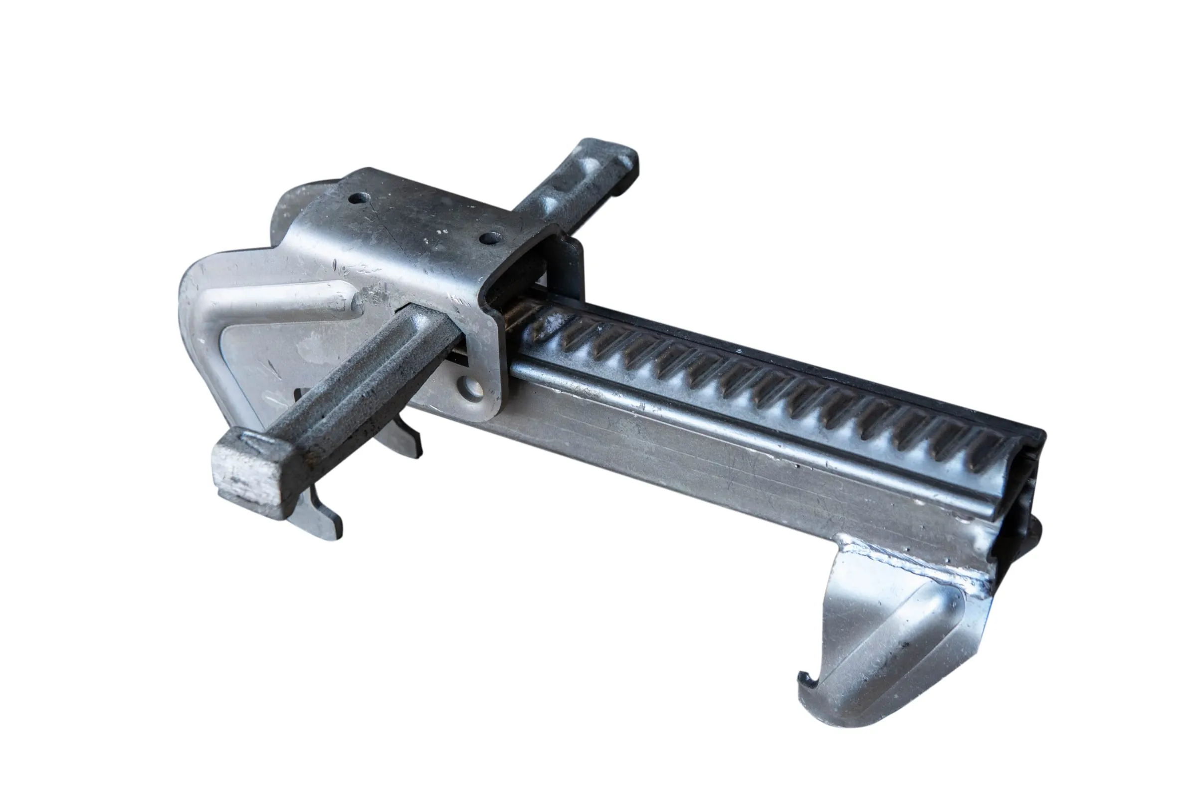 Универсальный реечный замок применяется для быстрой установки сборно-разборных вариантов опалубки под заполнение бетонной смесью. Обеспечивает жёсткость конструкции и сохранение конфигурации под серьёзными технологическими нагрузками. Установка замка гарантирует выравнивание линии щитов и надёжное стягивание. Фиксация элементов возможна даже при наличии между ними вставки (до 150 мм). Облегчает последующий демонтаж опалубки, позволяя провести его без повреждения затвердевшего бетона. Пригоден для многократной эксплуатации.