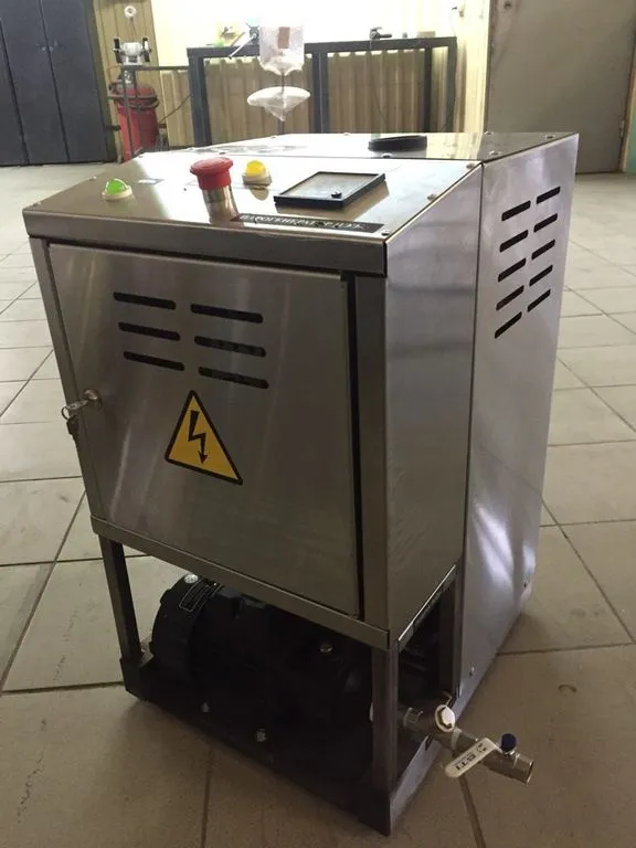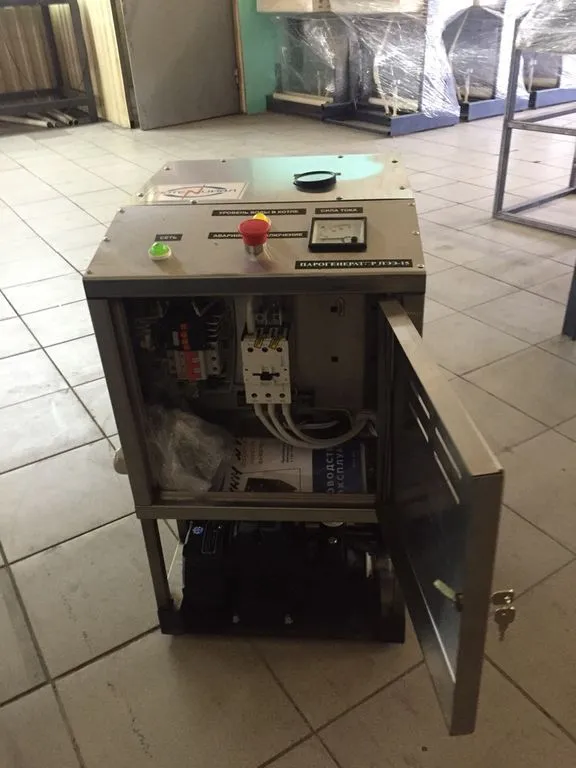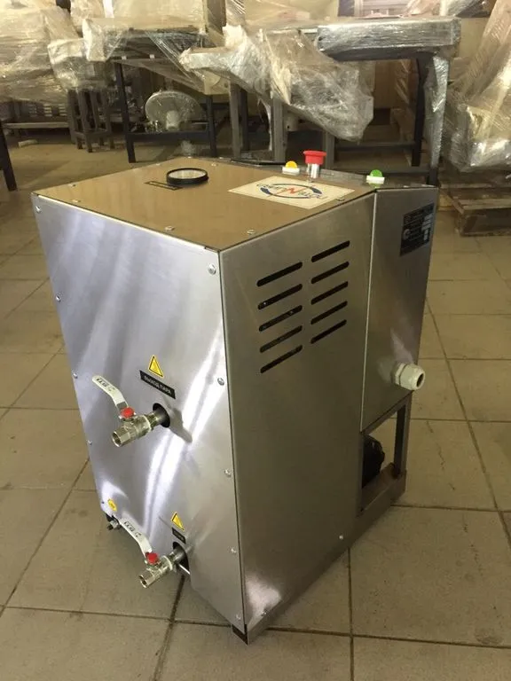Электрический электроводный парогенератор производит 15 кг пара в час. Корпус парового котла изготовлен из черного металла. Работает при номинальном напряжении питающей сети в 380 В.