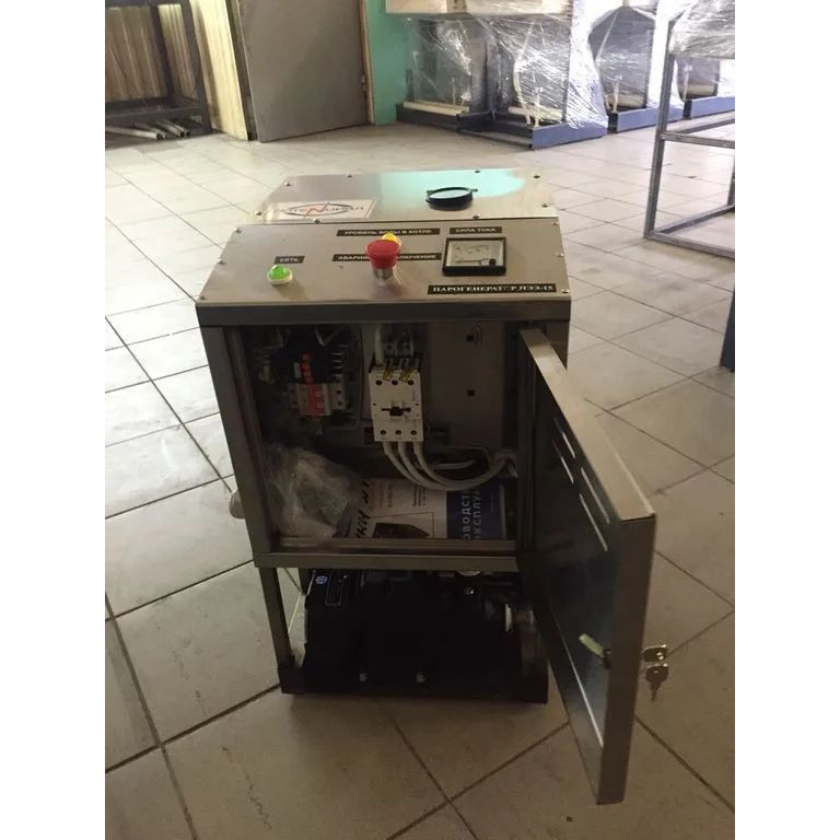 Электрический электроводный парогенератор обладает общей производительностью пара в 15 кг/час. Корпус парового котла изготовлен из нержавеющей стали, что повышает срок эксплуатации. Работает при номинальном напряжении питающей сети в 380 В.