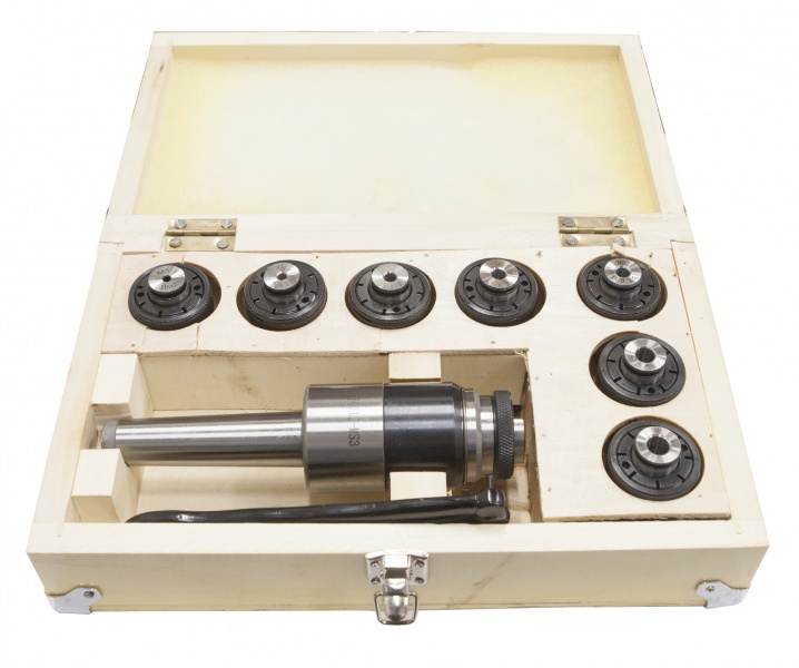 Патрон резьбонарезной под винт МТ-3 с набором цанг М12-М24(7шт.) Патрон применяется для резьбонарезания в сверлильных и фрезерных станках имеющих функцию резьбонарезания.