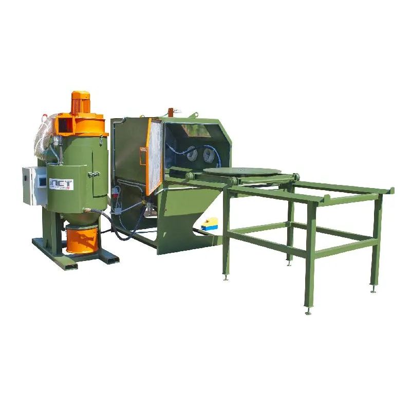 Может работать с песком, металлической или чугунной дробью, электрокорундом.