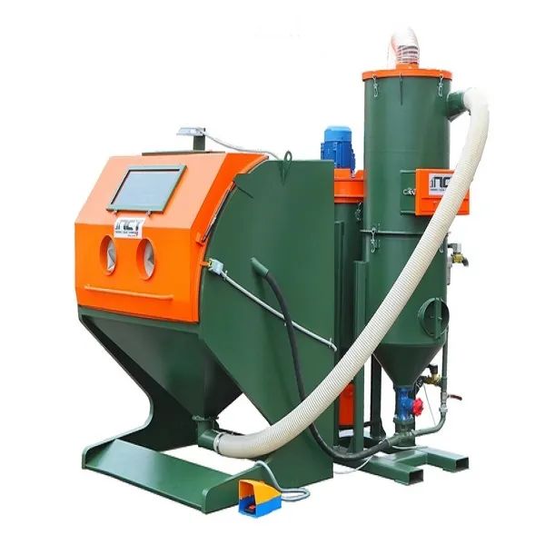 Камеры струйной очистки типа КСО. Абразивоструйные камеры бывают инжекторного и напорного типа. В камерах инжекторного типа КСО — воздух и абразив подаются по двум разным рукавам. Воздух по рукаву подается непосредственно в соплодержатель, в котором установлены два сопла: абразивоструйное и воздушное. Между соплами создается разряжение, за счет которого происходит подсос абразива. Скорость и энергия воздушно-абразивной струи при инжекторном типе значительно ниже, чем в напорном, что удовлетворяет при небольших объемах работ.