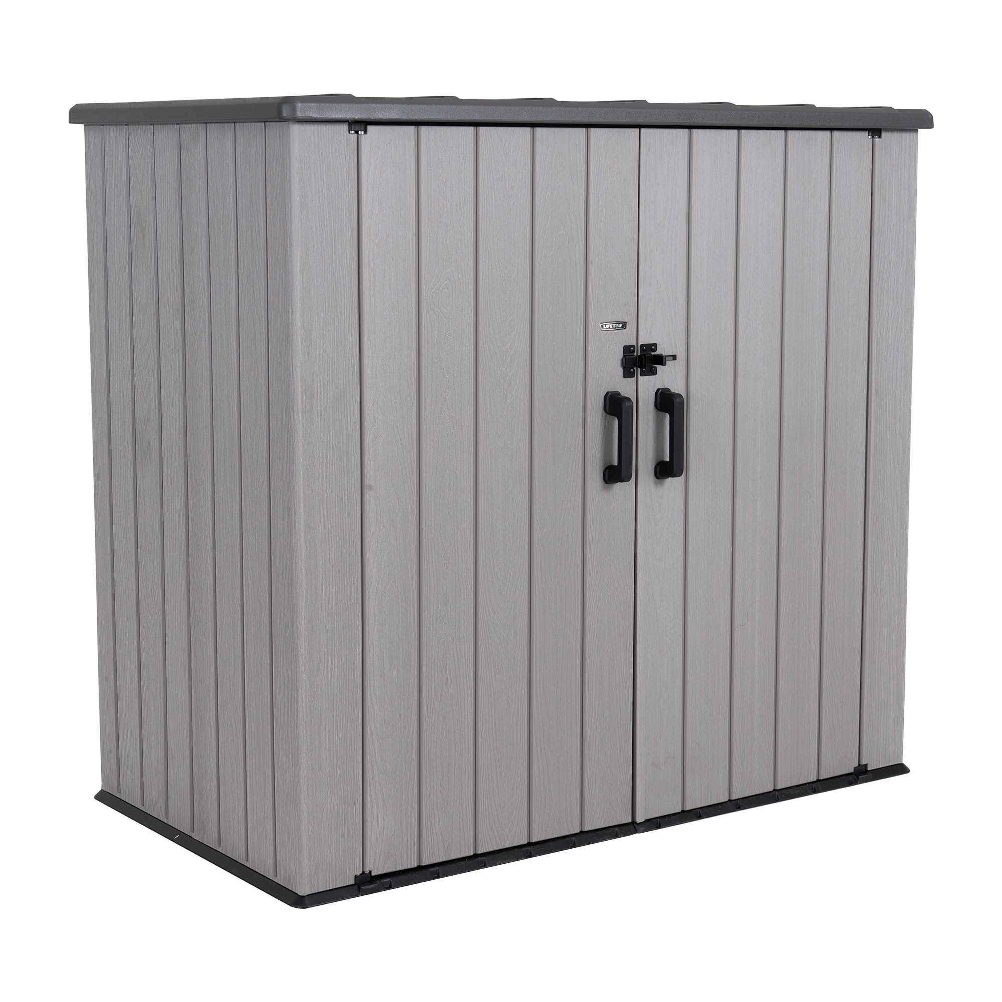 Хозяйственный ящик вместит в себя бытовые мусорные контейнеры, газонокосилки (шириной до 60см) и велосипеды, он также укомплектован стеллажами и съемными настенными крючками для небольших предметов, таких как ручной инструмент, шнуры питания, лопаты, грабли.