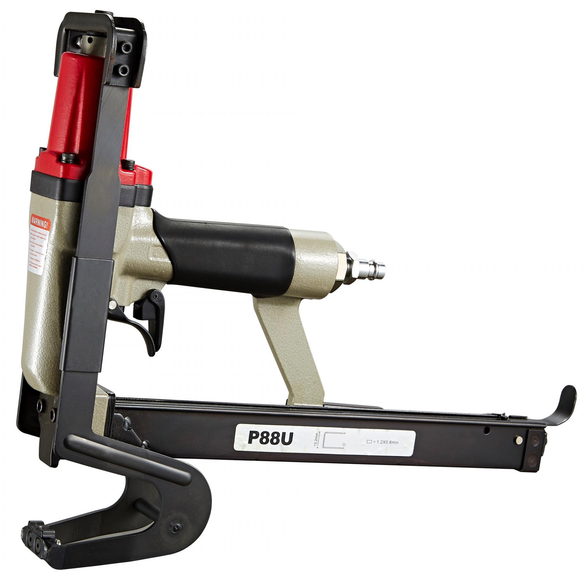 Скобозажимной пневмостеплер meite P88U профессиональный инструмент с контрупором для загибания скобы, Применяется при изготовлении матрацев, натяжки и крепления тканей к проволочным каркасам. Комфортная рукоятка, Двойной курок с предохранителем, Быстросъемная крышка магазина для комфортного извлечения скобы при заминании в механизме.