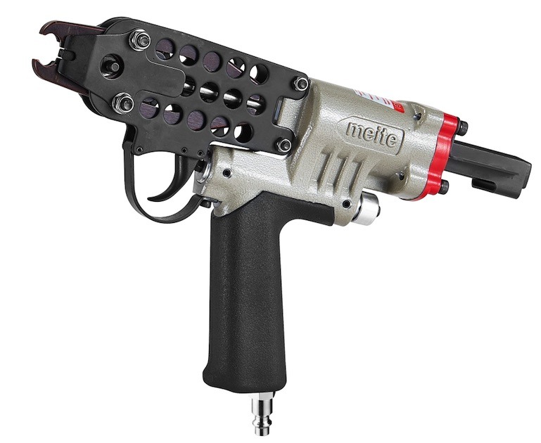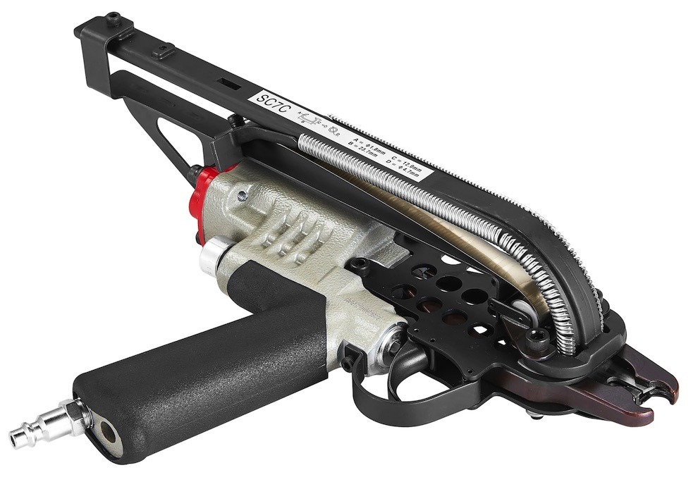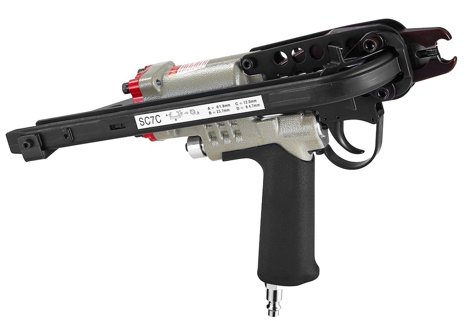 Скобообжимной пневмопистолет meite SC7C — профессиональный инструмент для габионов и изготовления и сборки клеток для домашней птицы; вольеров; ограждений из проволчных сеток; анатомических, пружинных матрасов; прекрасно подойдет для перетяжки автомобильных сидений и кресел. Применяемый крепеж — тип C-Ring калибр 15Ga (сечение 1,8 мм) 24×12