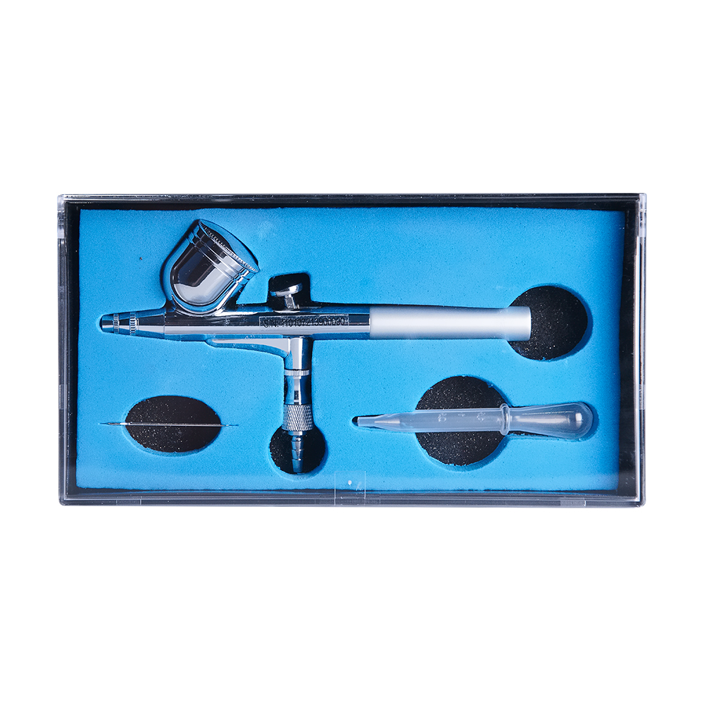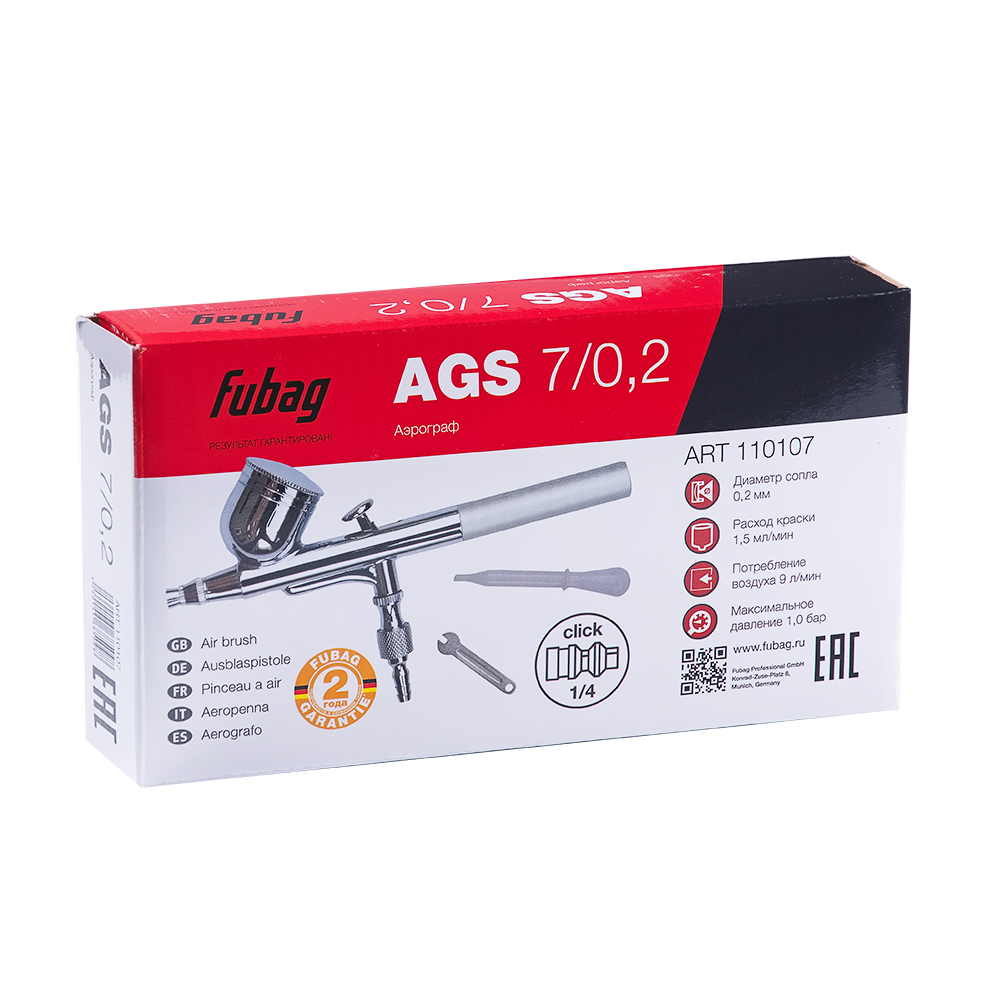 Аэрограф Fubag AGS7/0.2 с удобной ручкой. Сопло маленького диаметра (0,2 мм) отлично подходит для тончайшего нанесения краски и рисования мелких элементов. Высокочувствительный регулятор подачи воздуха и краски.