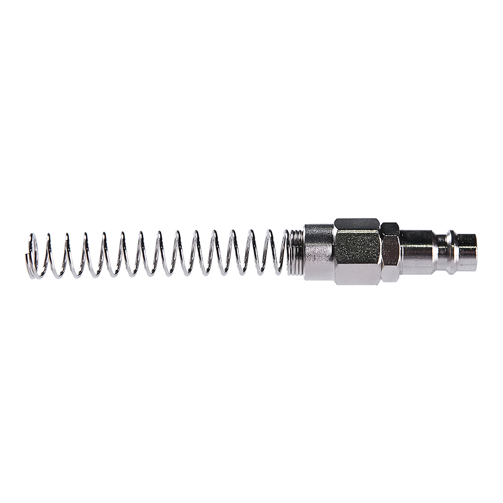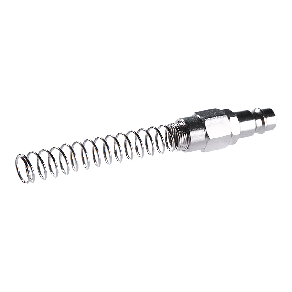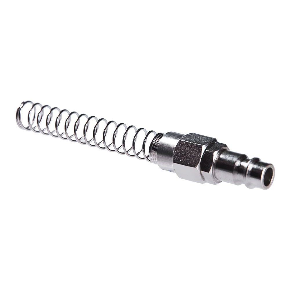 Переходник для подключения компрессора к пневмоинструменту. С одной стороны фитинг рапид папа, с другой — пружина 8×12 мм, которая не позволяет шлангу перегибаться и деформироваться в месте соединения.