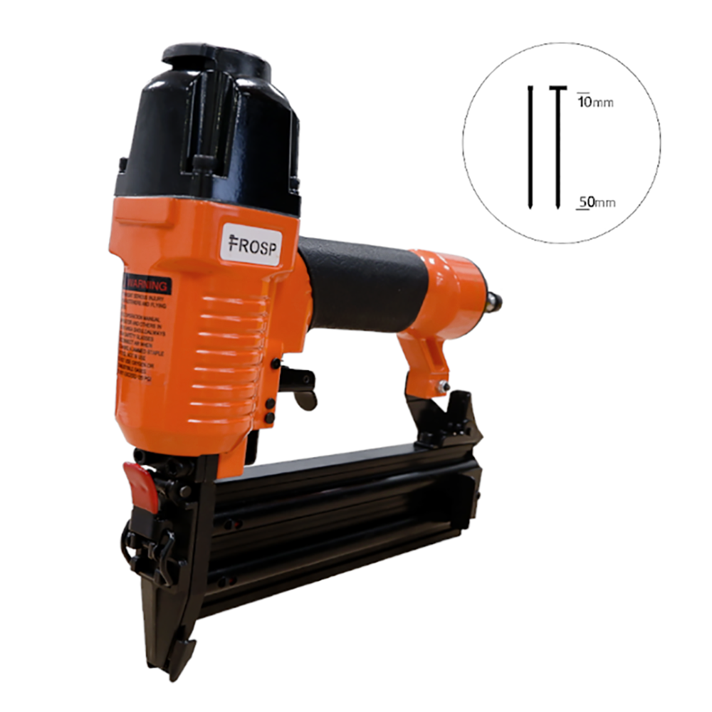Нейлер штифто-шпилькозабивной пневматический FROSP F50 представляет собой надежный гвоздезабивной инструмент для ускоренного выпуска штифтов\гвоздей. Пневмомолоток оснащен обоймой на 100 штифтов. Допустимый размер штифта для работы этого пневматического гвоздезабивателя — 10-50 мм. Этот пневмопистолет в совокупности с производительностью сочетает в себе компактность и простоту применения. Поэтому используется во многих областях. Пневмомолоток для забивания штифтов этой модели работает при давлении в 4-7 атмосфер, в зависимости от условий эксплуатации.