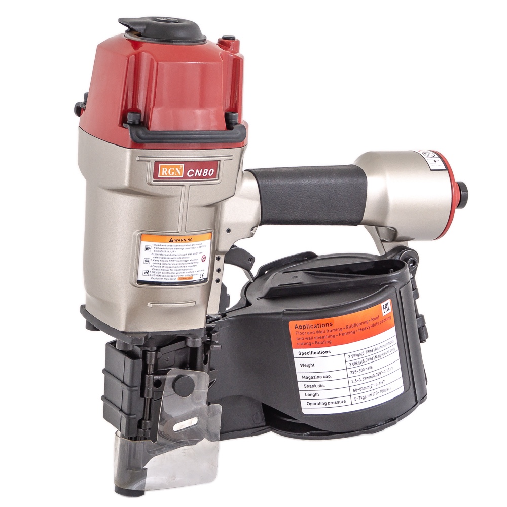 Пневмомолоток для забивания барабанных гвоздей CN80R — это простой и надежный, а также производительный нейлер, изготовленный на Тайване. Рекомендован к применению на производствах при изготовлении и ремонте паллет (поддонов) и других изделий из дерева, таких как тара, ящики и упаковка. Надежная конструкция и заложенный производителем ресурс позволяют эксплуатировать инструмент не только в специально отведенных местах внутри помещений, но и на открытом воздухе с переменной влажностью и температурой до минусовых значений. Высокая скорость обеспечивается тремя выстрелами в секунду и позволяет увеличить производительность по сравнению с обыкновенным ручным трудом в четыре раза. Гвоздезабиватель пневматический крайне надежен и прост в эксплуатации, работа с ним не требует специальных знаний и навыков. Дополнительную безопасность труда обеспечивает наличие предохранителя от «шального» выстрела. Используемые барабанные гвозди на проволочной сцепке — гладкие, а также с винтовой и кольцевой насечкой и с длиной от 50 мм до 83 мм. Рекомендован для приобретения пользователями с ограниченным бюджетом.
