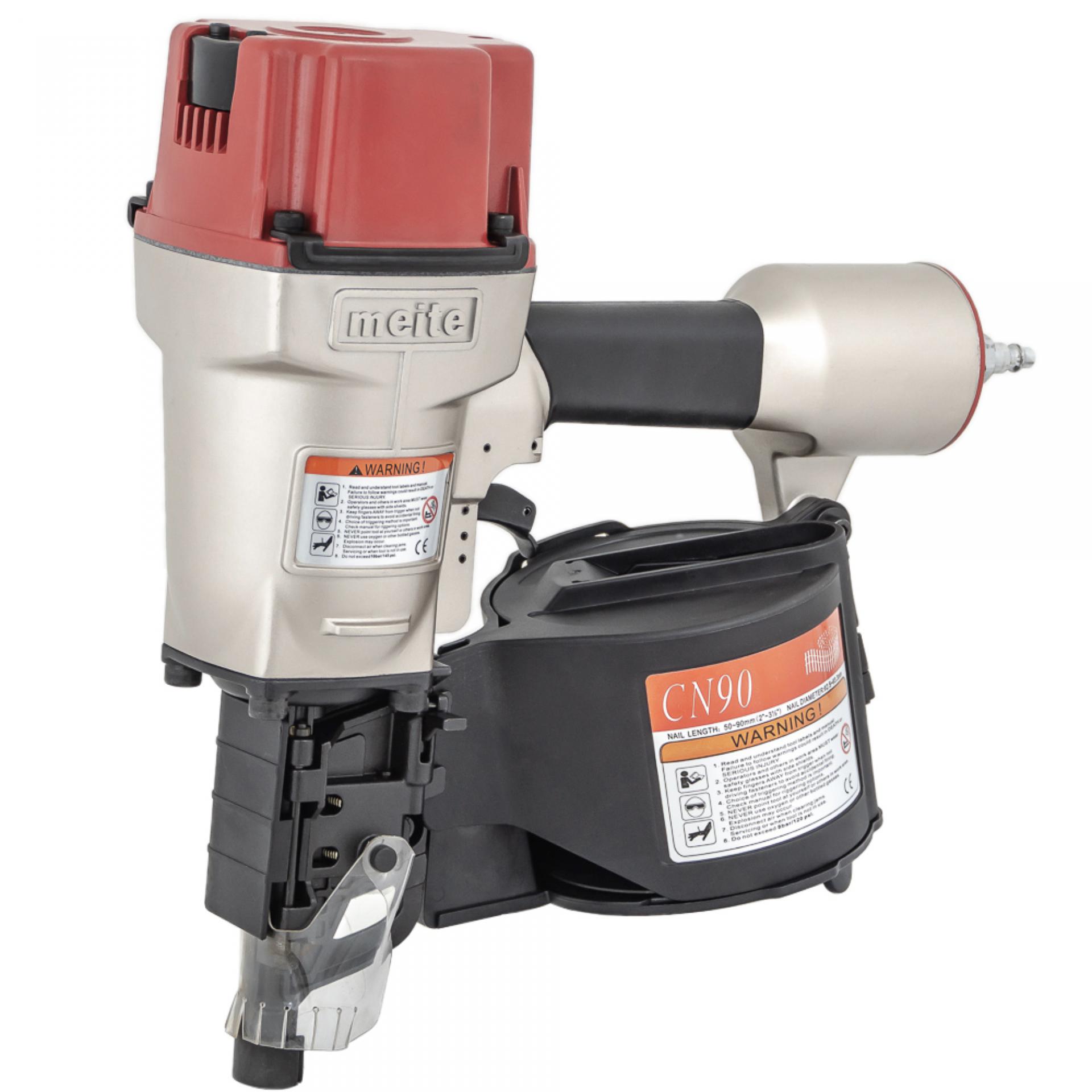 Пневмопистолет для забивания барабанных гвоздей CN90 meite — это простой и надежный, а также производительный инструмент, изготовленный в Китае. Рекомендован к применению при изготовлении и ремонте паллет (поддонов) и других изделий из дерева, таких как тара, ящики и упаковка. Надежная конструкция и заложенный производителем ресурс позволяют эксплуатировать нейлер пневматический для гвоздей 90 мм не только в специально отведенных местах внутри помещений, но и на открытом воздухе с переменной влажностью и температурой до минусовых значений. Высокая скорость обеспечивается тремя выстрелами в секунду и позволяет увеличить производительность по сравнению с обыкновенным ручным трудом в четыре раза. Пневмогвоздобой крайне надежен и прост в эксплуатации, работа с ним не требует специальных знаний и навыков. Дополнительную безопасность труда обеспечивает наличие предохранителя от «шального» выстрела. Используемые барабанные гвозди на проволочной сцепке — гладкие, а также с винтовой и кольцевой насечкой и с длиной от 45 мм до 90 мм. Данный нейлер 90 мм отличается невысокой ценой и рекомендован для приобретения пользователями с ограниченным бюджетом.