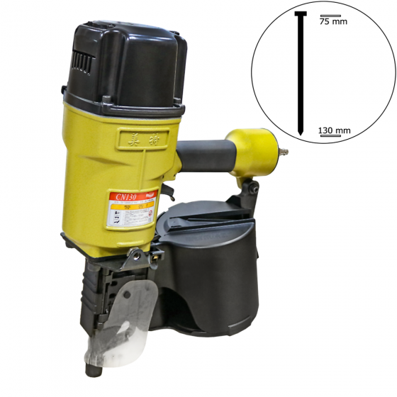 Нейлер пневматический Meite CN-130 гвоздезабивной предназначен для использования в строительстве, при проведении монтажных и ремонтных, упаковочных работ. Этот пневмомолоток для забивания гвоздей позволяет значительно сократить время работы и трудозатраты. Инструмент оснащен обоймой вместимостью от 225 до 300 гвоздей. При этом максимальная длина гвоздей — 130 мм, минимальная — 75 мм. Пневмопистолет работает при давлении 7,7 бар-9,8 бар.