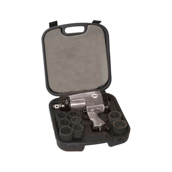 В комплект набора входит: пневмогайковерт, 8 головок 3/4″, 1 масленка, 2 шестигранных ключа 4 и 5 мм, 1 штуцер, кейс.
