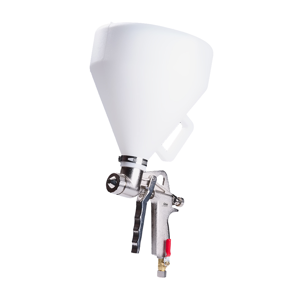 Диаметр сопел регулируется под разные диаметры фракций. Большая скорость работы. Долговечность. При использовании текстурного пистолета отсутствует вероятность отслаивания материала, поскольку смесь более однородна, чем при нанесении шпателем. Комплектация 3 сопла на 4, 6, 8 мм.