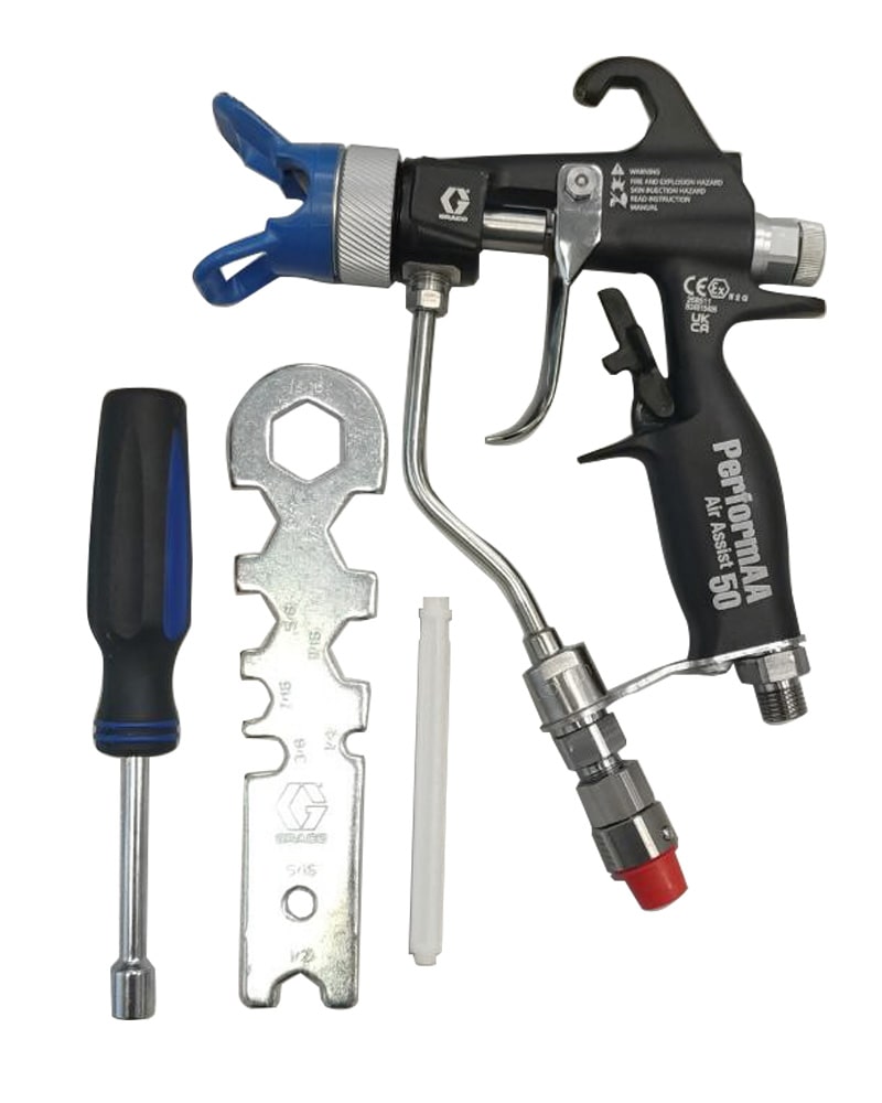 Краскораспылитель комбинированного распыления Perform AA 50, производства компании Graco (США) на сегодняшний день — лучший инструмент для работы по нанесению высококачественных материалов методом комбинированного распыления. Модель 26B511 применяется с «таблеточными» соплами (Flat) Graco — GG4, GGW, AXF, AXM. Применение этих сопел обеспечивает максимальное качество готового покрытия. Основная сфера применения — мебельное производство, окраска изделий и комплектующих из дерева и пр.