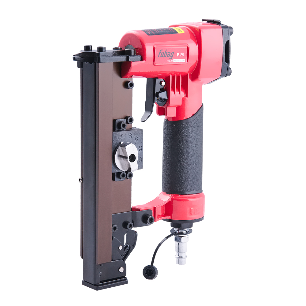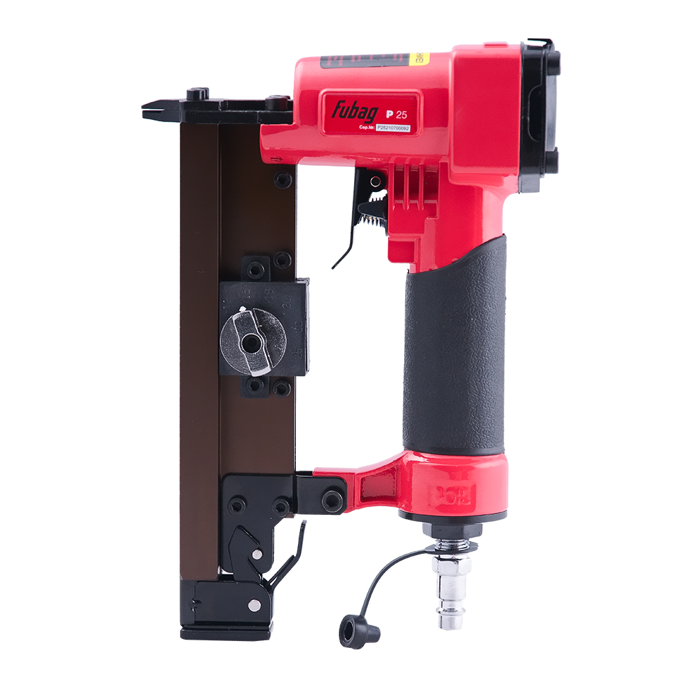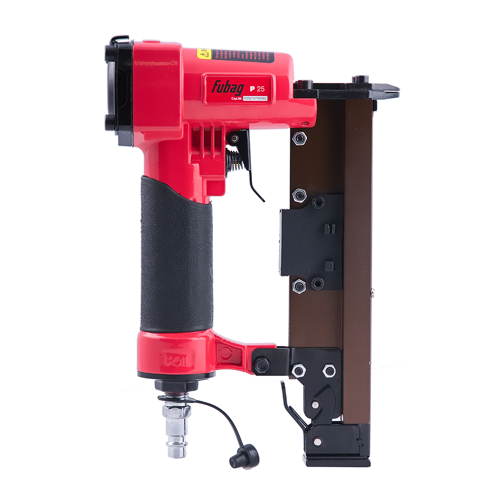 Шпилькозабивной пневматический степлер Fubag P25 необходим в отделочных работах (крепление наличников, штапиков рам, элементов декора и т.п.). Для работы используются шпильки без шляпки малого диаметра, длиной 10-25 мм, что делает крепление надёжным и практически незаметным.
