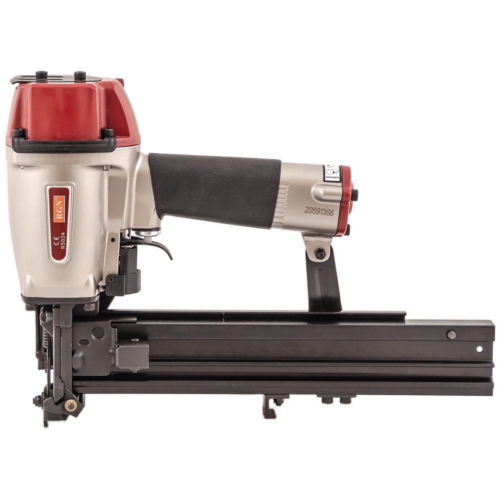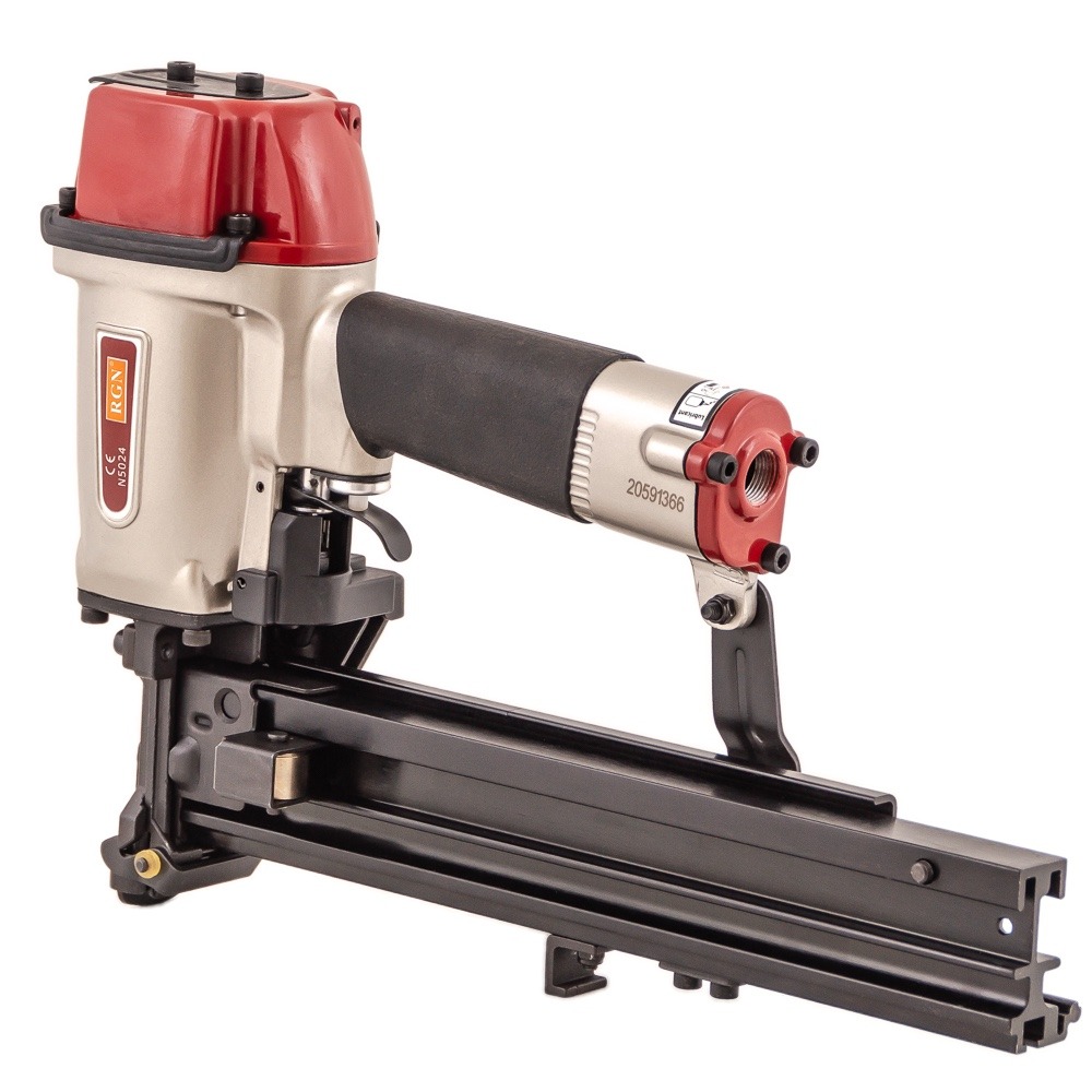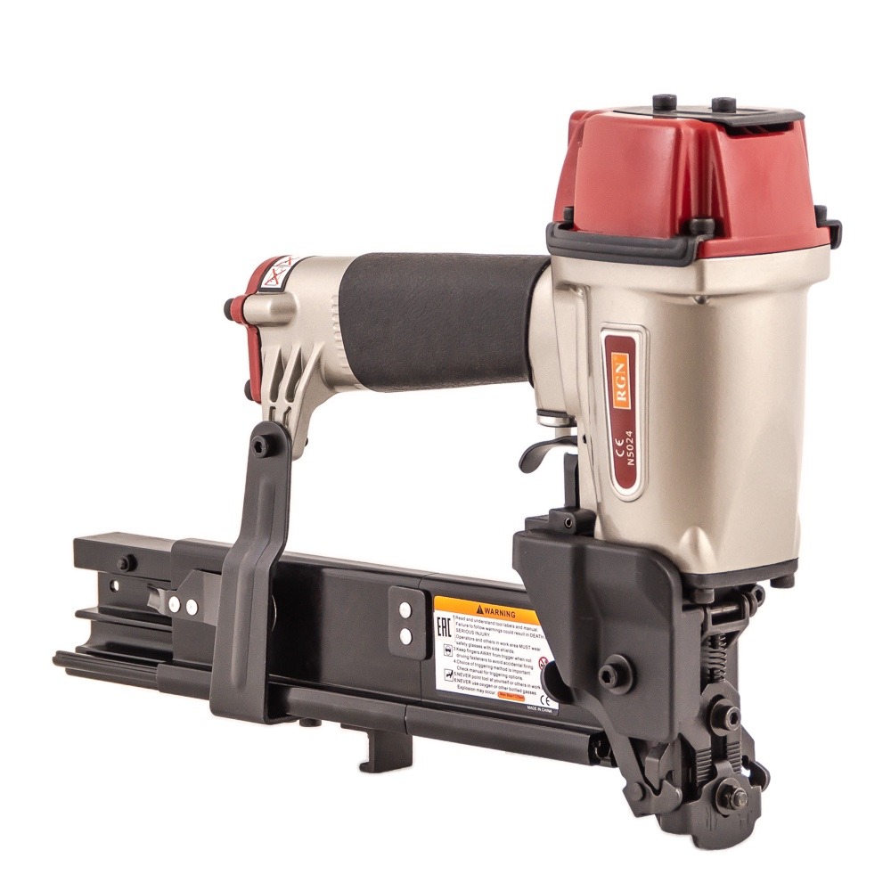 Скобозабивной пневмопистолет N5024R для широкой (26,4 мм) каркасной скобы. Используется при изготовлении мебельных каркасов, деревянной тары, других конструкций из дерева, а также при проведении строительных и отделочных работ. Применяемый тип скобы: Omer WP, Prebena WS, Senco P, длина 16-50 мм. Калибр проволоки — 16Ga (1.6×1.4 мм) Ширина спинки 26,4 мм.