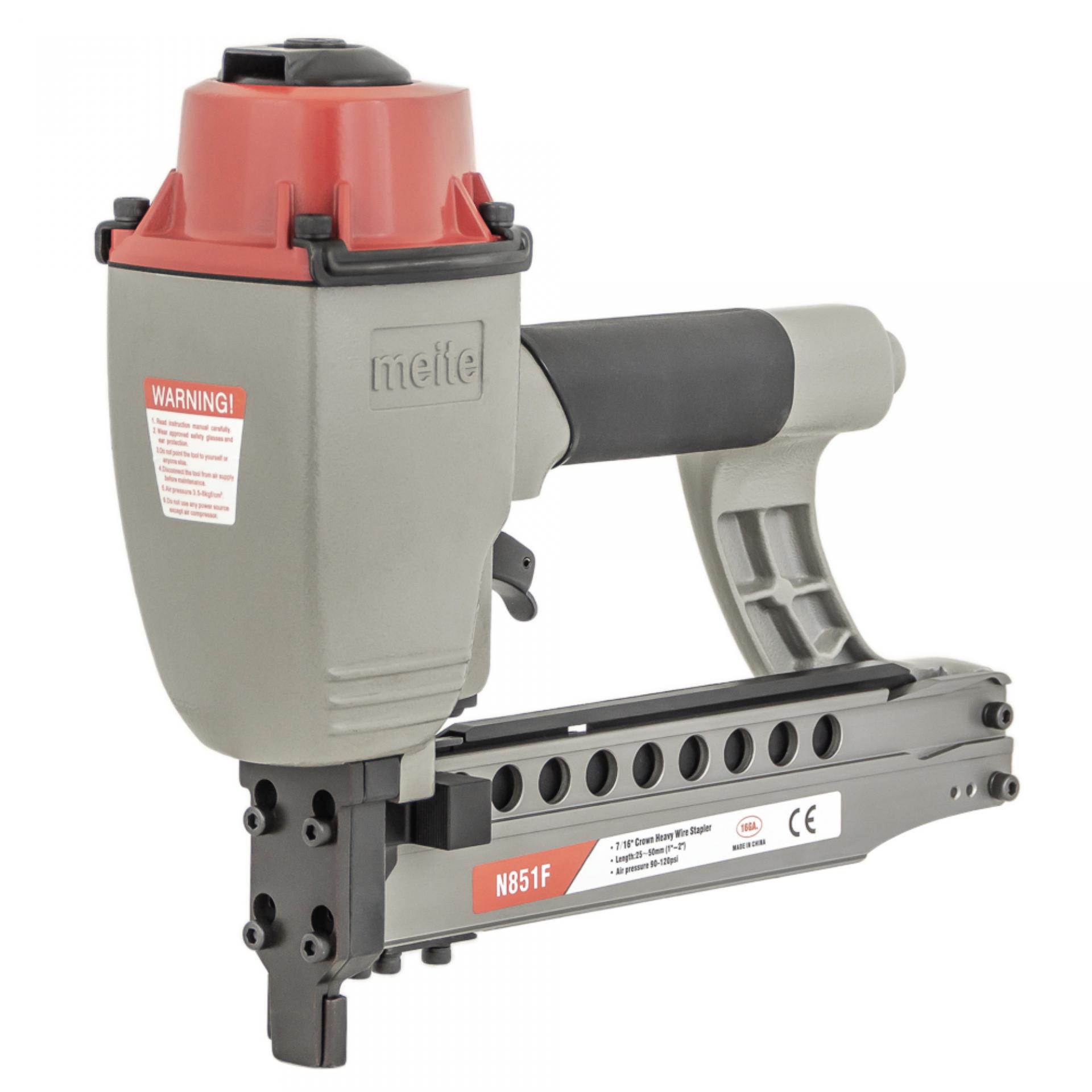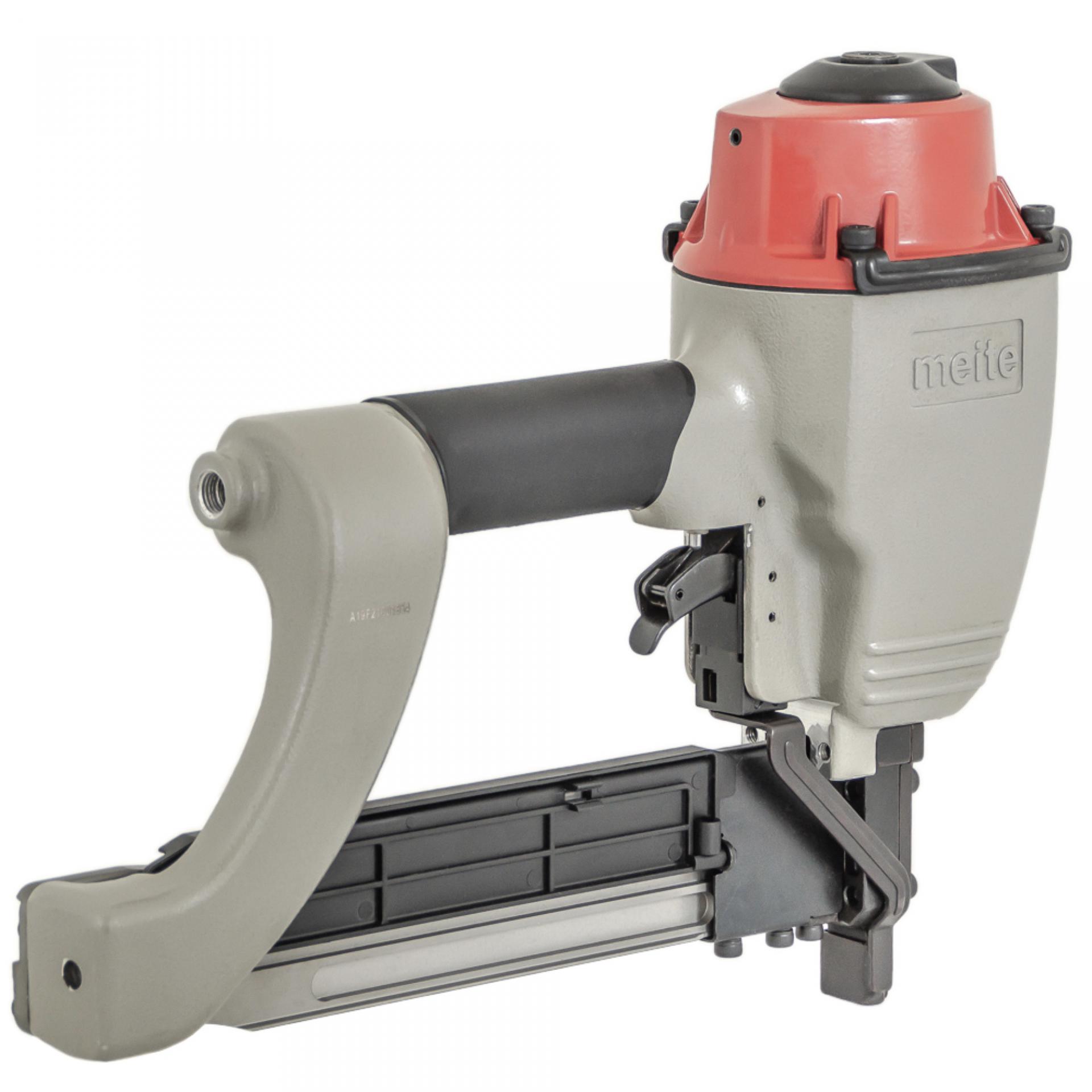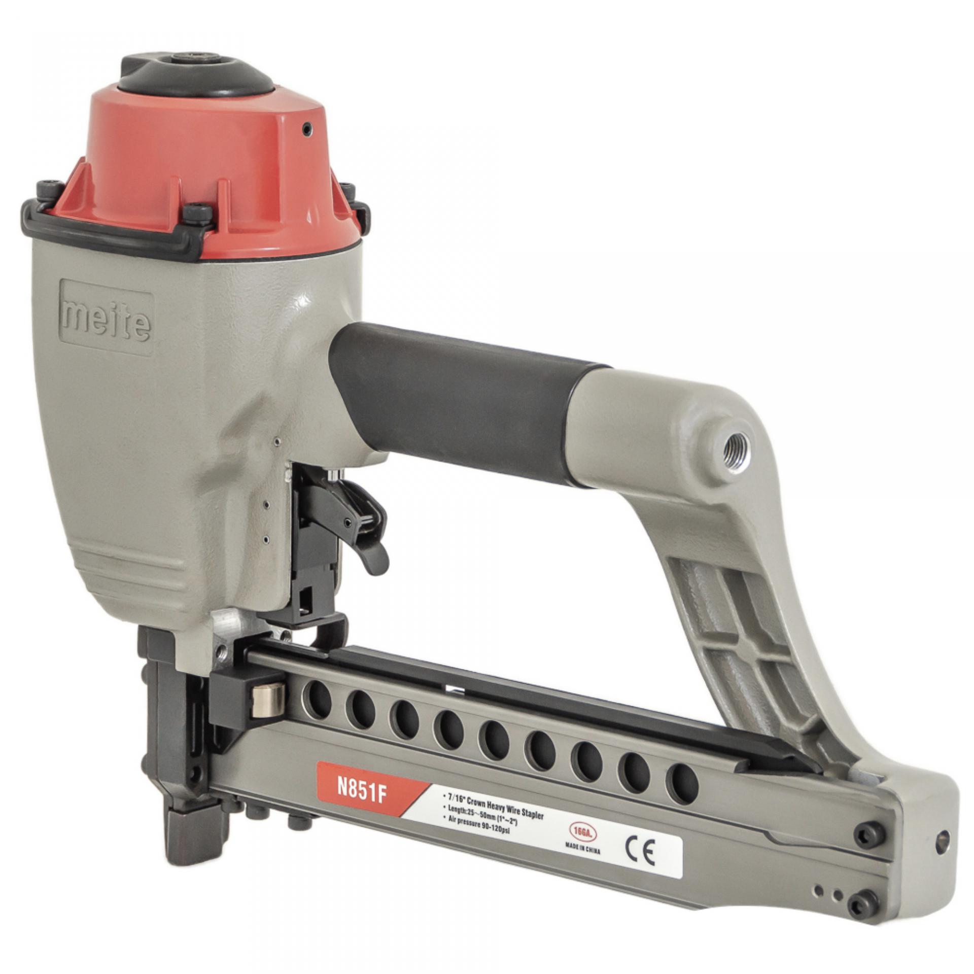 Скобозабивной пневматический пистолет meite N851F — это промышленная модель инструмента для каркасных скоб большого сечения, «стреляющий» мебельной скобой калибра 16Ga, спинка 10,8 мм длина от 25 мм до 50 мм. Применяется в первую очередь при изготовлении мебельных каркасов, рамок, опбрешеток и прочих деревянных изделий в специально организованных местах как внутри помещений, так и на открытом воздухе с переменной влажностью и минусовой температурой. Высокая производительность. Степлер надежен и прост в эксплуатации, работа с ним не требует специальных знаний и навыков. Используемые скобы: тип M2, Bea 155, Prebena L, Senco N