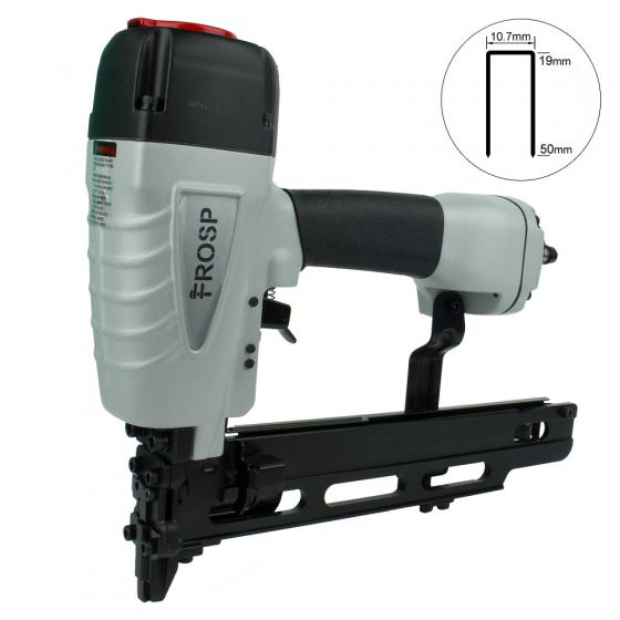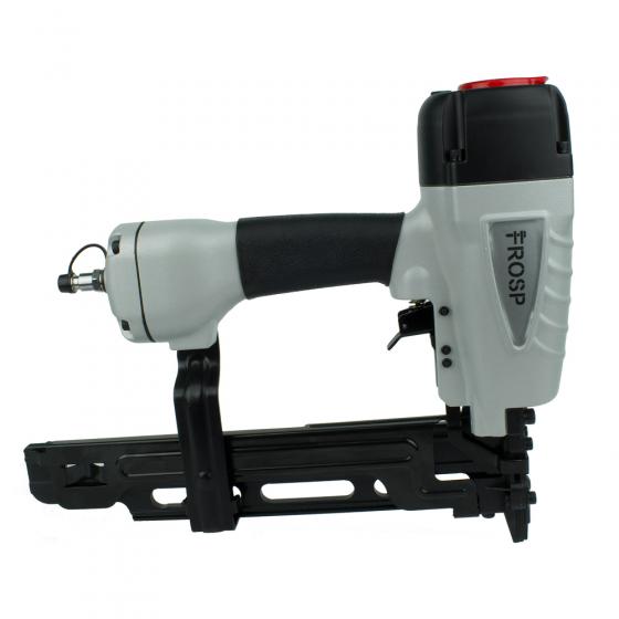Пневмопистолет данного типа модели FROSP K-N851 имеет компактные размеры и относительно небольшой вес. При этом обладает высоким качество работы, надежностью и долговечностью. Работает со скобами, ширина спинки которых составляет 10,7 мм, а длина – 19-50 мм.