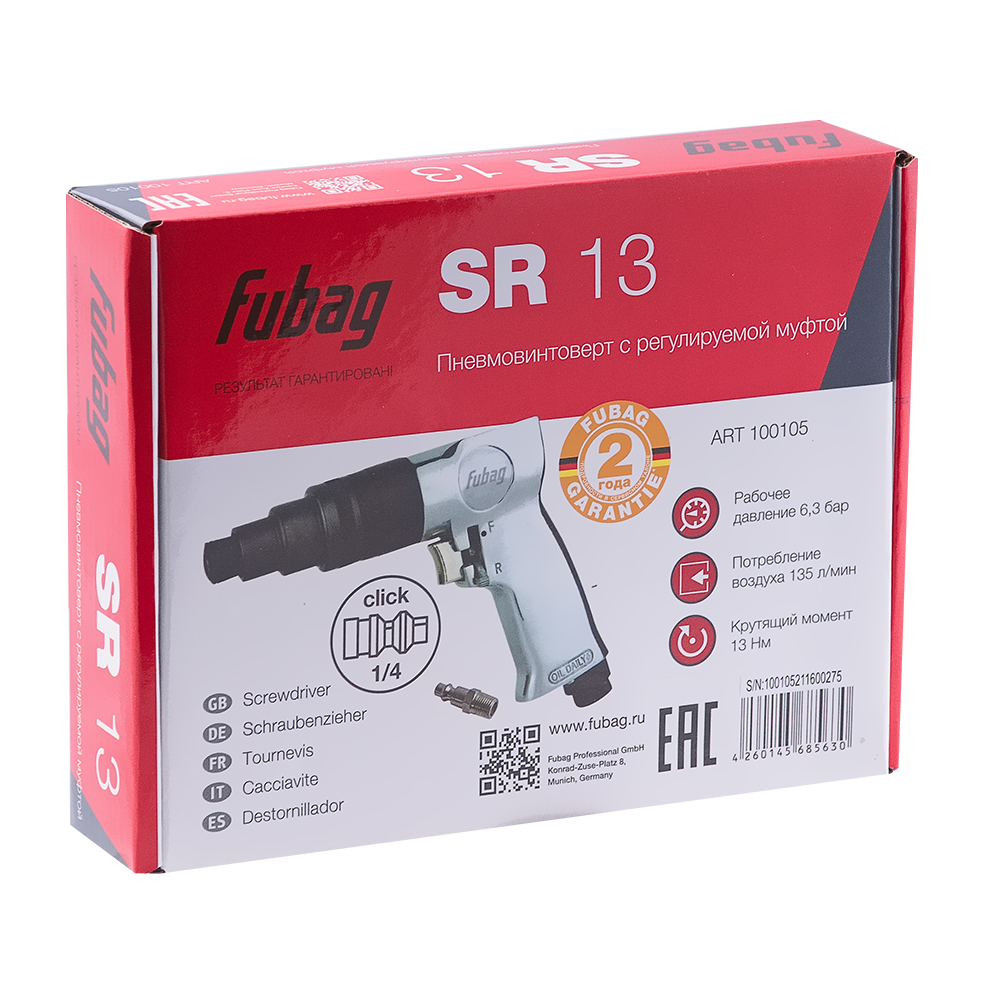 Пневмовинтоверт SR135/13 (100105) FUBAG. Пневматический винтоверт ресиверного действия с регулируемой муфтой.