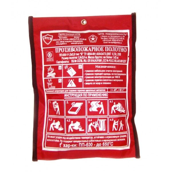 (ПП) предназначено для локализации горения в начальной стадии пожара, тушения горящей одежды на пострадавшем, защиты горючих конструкций и оборудования при проведении огневых работ (возгорания классов А, В, Е). Температурный режим от 300 до 1000°C. Изготовлено из минерального стекловолокна.