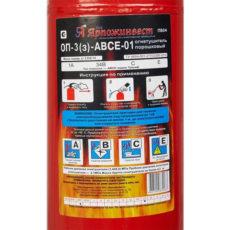 Огнетушитель приводится в действие посредством энергии газа, который закачивается в корпус вместе с порошковой смесью. Масса данной модели ОП-3 равняется 3 кг. После приведения огнетушителя в действие оно подается в течение 8 секунд. Температурный режим эксплуатации — от минус 40 до плюс 50 ºС.