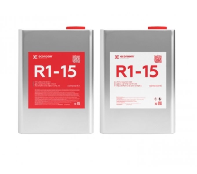 Смола ecoroom R-15 представляет собой двухкомпонентную полиуретановую смолу, медленно реагирующую и эластичную. Смола не содержит растворителей. Части состава (Компонент А, компонент Б) поставляются в определённых пропорциях и смешиваются непосредственно перед применением. После реакции с водой образуют плотную, водонепроницаемую, твердоэластичную пену.